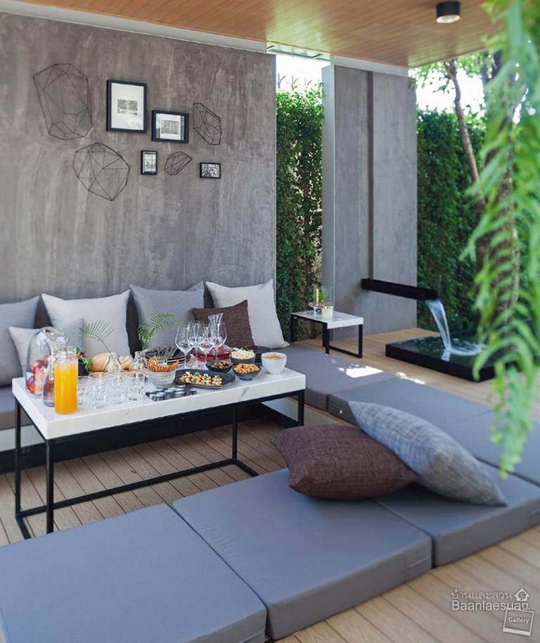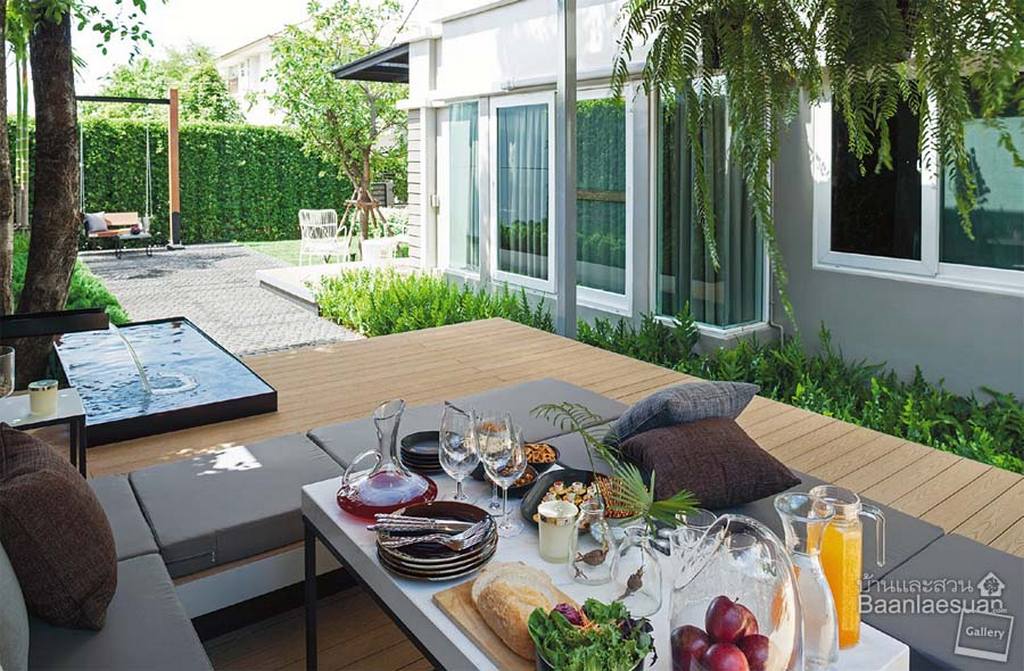 การออกแบบสวนให้มีพื้นที่เชื่อมต่อออกมาจากบ้าน เป็นรูปแบบนิยมของผู้คนยุคใหม่ที่ต้องการใช้พื้นที่สวนให้คุ้มค่า สวนโมเดิร์น เส้นสายเรียบๆ องค์ประกอบน้อยๆ มีฮาร์ดสเคปเป็นหลัก ดูแลง่าย จึงตอบโจทย์การใช้งานของเจ้าของบ้านที่มีเวลาดูแลสวนไม่มากนัก และนิยมชมชอบสวนที่ให้ความรู้สึกเป็นมากกว่าเพียงพื้นที่พักผ่อน สวนโมเดิร์นข้างบ้าน