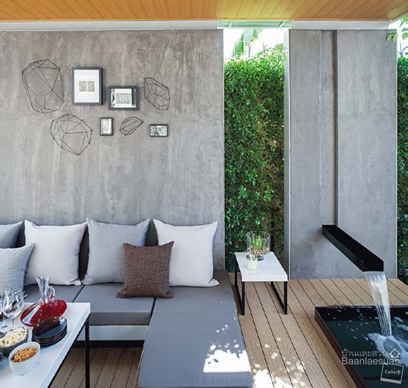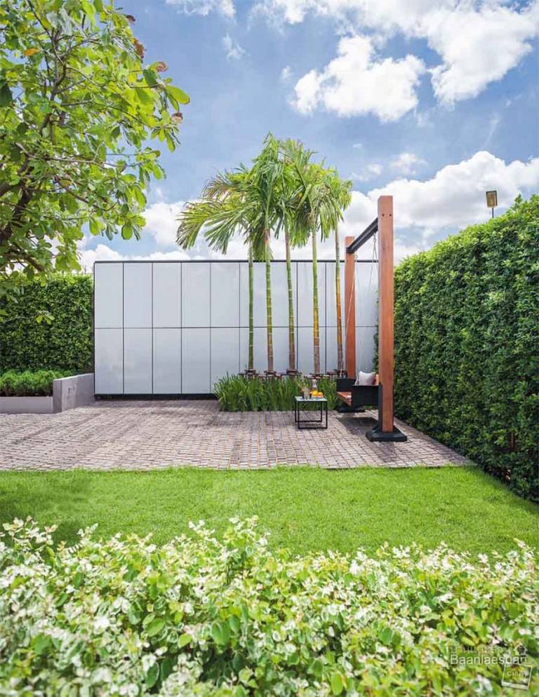 บนพื้นที่ 110 ตารางวา ของบ้านหลังนี้มีการออกแบบพื้นที่สวนให้ตอบรับไลฟ์สไตล์ของเจ้าของบ้าน เริ่มตั้งแต่พื้นที่ด้านหน้าแบ่งส่วนหนึ่งเป็นสนามหญ้าและลานกว้างปูแผ่นคาร์เป็ตสโตน เว้นจังหวะเป็นแปลงต้นไม้สี่เหลี่ยมเรียบๆ พื้นผิวแบบนี้ทั้งดูแลง่ายและได้อารมณ์แบบสวนโมเดิร์น จุดเด่นของมุมนี้คงหนีไม่พ้นผนังสีเทา เหล็กสีเทาเรียบให้ความรู้สึกทันสมัย มุมนี้ยังดัดแปลงเป็นฉากฉายภาพยนตร์ให้เจ้าของบ้าน นำบีนแบ็กออกมานั่งเอกเขนกดูหนังในวันอากาศดีได้อีกด้วย เมื่อเดินต่อเนื่องไปยังข้างบ้านจะพบกับศาลาที่เชื่อมออกมาจากห้องรับประทานอาหาร ตัวศาลาออกแบบให้มีรูปทรงเรียบแต่เล่นระดับพื้นภายในศาลาให้เป็นที่นั่ง มีบ่อน้ำตกทันสมัย คุณพลอย-พลอยทับทิม สุขแสง จากบริษัทกิ่งก้านใบ จำกัด เล่าถึงการเลือกใช้วัสดุและการออกแบบสวนของบ้านหลังนี้ว่า
