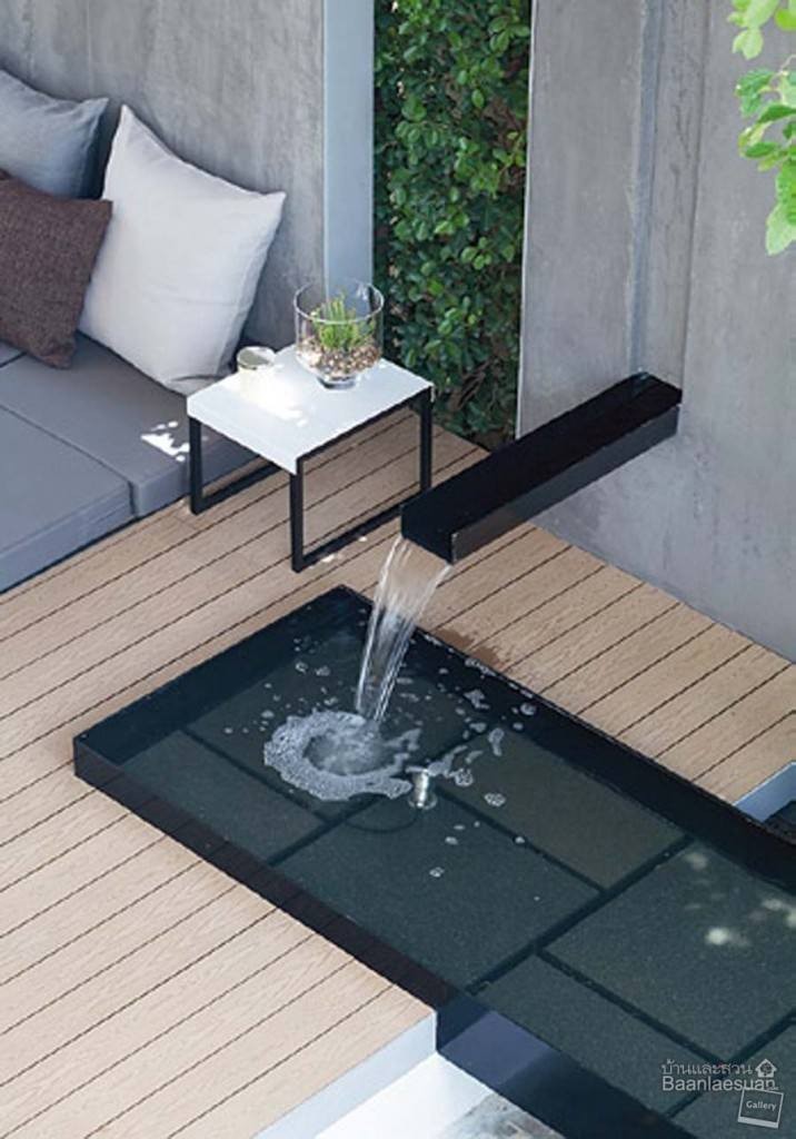 “ไฮไลต์ของสวนนี้คือจะมีมุมไว้ให้เพื่อนๆมาปาร์ตี้ได้ ออกแบบเป็นศาลาเล่นระดับให้เป็นที่นั่งในตัว เพียงนำเบาะมาวางก็สามารถนั่งเล่นได้ ตรงส่วนศาลาอยากให้ดูเนี้ยบ ไม่อยากให้เห็นโครงเยอะ เลยติดเป็นฝ้าไปเลย ใช้ฝ้าไม้เทียมแต่งด้วยไฟดาวน์ไลท์ และนำเอาสีดำมาตัด ดีเทลที่เพิ่มมาจะเป็นพวกขอบ ซึ่งปกติจะปิดด้วยไม้ แต่อันนี้เราจะโชว์วัสดุที่เป็นเหล็กนำมาทำเป็นขอบเลย แต่ละจุดจะซ่อนไฟไว้เพื่อใช้งานด้วย ตัวบ่อน้ำตอนแรกไม่ได้ดีไซน์ให้อยู่ตรงนี้ แต่เจ้าของบ้านอยากให้มีบ่อน้ำจะได้ดูสดชื่น ข้อแม้คือไม่อยากดูแลรักษาเยอะ จึงทำเป็นบ่อตื้น เอาแกรนิตมาวางให้มันเห็นแพตเทิร์นกราฟิก ตัวบ่อใช้แผ่นเหล็กทั้งหมด ส่วนด้านล่างเราทำโครงปูนรองไว้ ก็จะดูเหมือนลอยออกมา ระบบปั๊มน้ำก็ซ่อนไว้ด้านล่างทั้งหมดให้ดูเรียบร้อย”