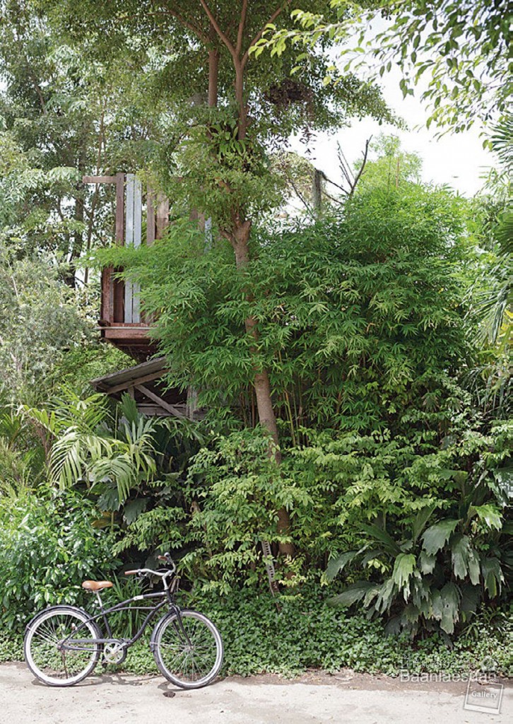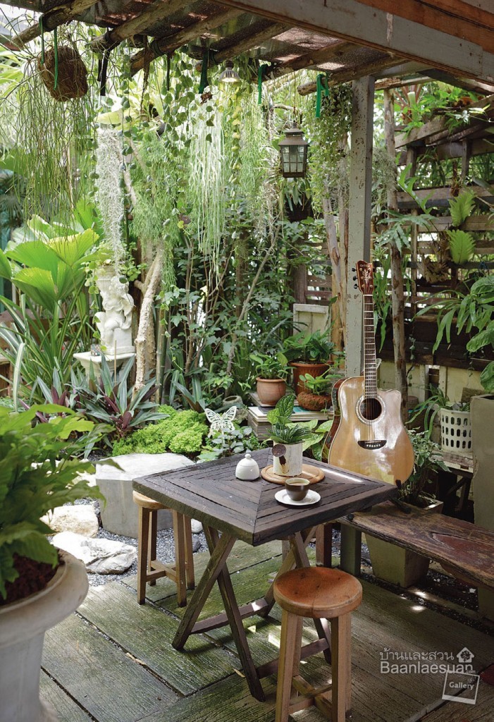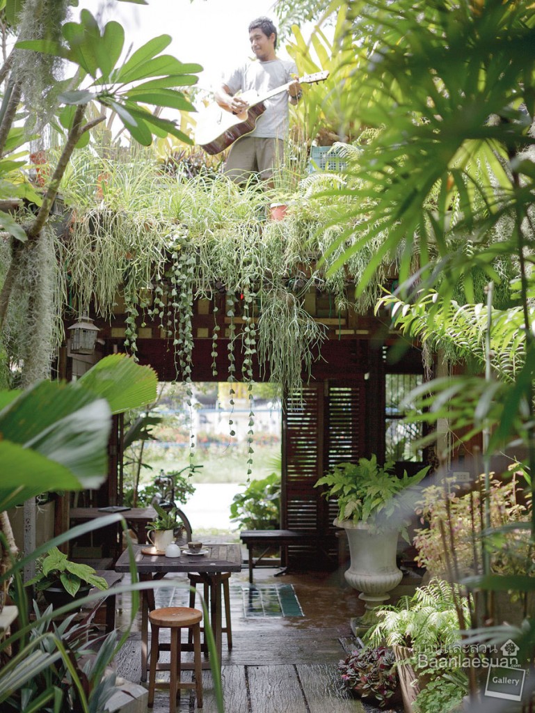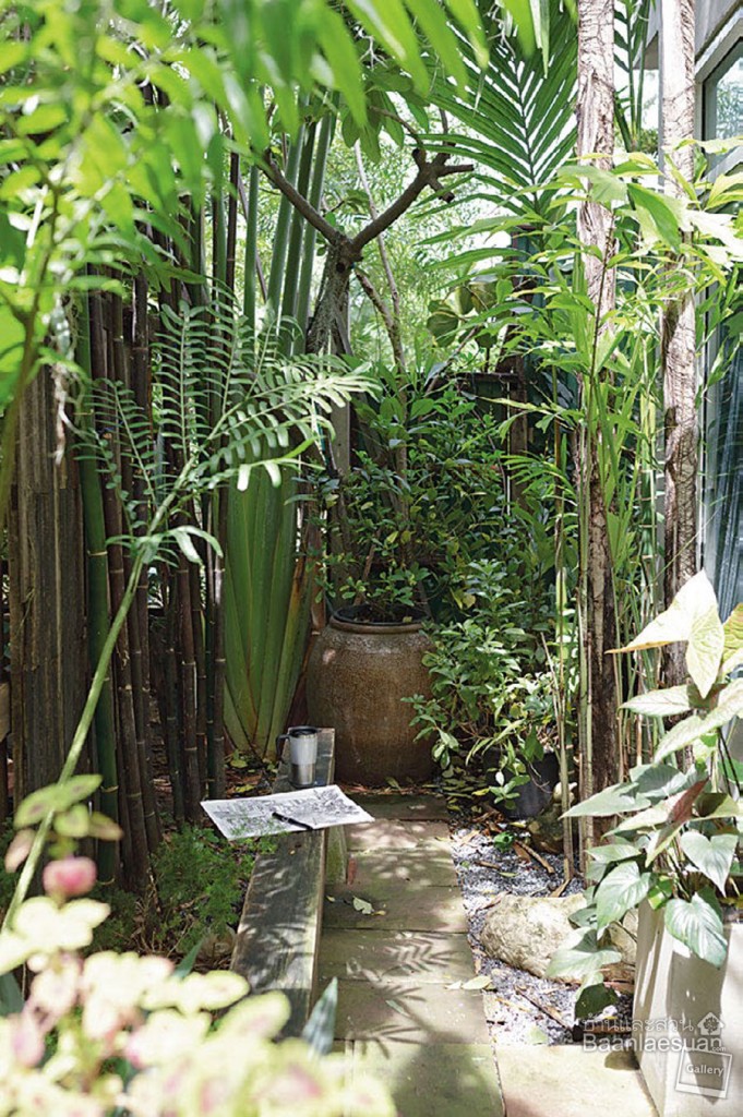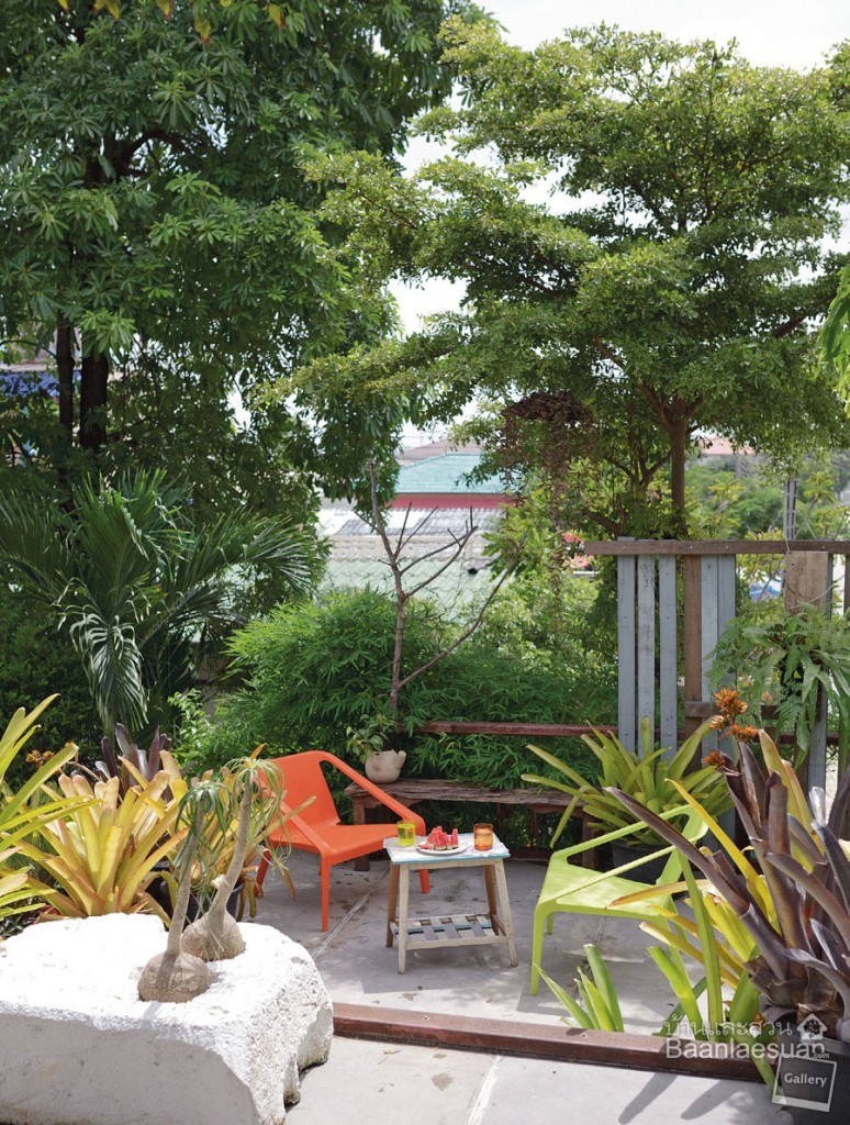 “คนส่วนใหญ่มักคิดว่าการจัดสวนต้องใช้เงินเยอะ จริงๆแล้วถ้าเราลงมือจัดเองก็จะประหยัดค่าใช้จ่ายได้มากขึ้น ผมเริ่มจากซื้อต้นไม้ทีละ 2,000-3,000 บาท มีเงินพอซื้อเท่าไรเราก็ซื้อแค่นั้น เฟอร์นิเจอร์ในสวนผมก็ทำเองทั้งหมด ซื้อเศษไม้ชิ้นเล็กชิ้นน้อยมาประกอบกันทำเป็นม้านั่ง ประตู และรั้วในสวน ส่วนของแต่งสวนก็มาจากสิ่งของเหลือใช้อย่างเช่น ตะกร้า กระติกน้ำ กระป๋องเครื่องดื่ม ค่อยๆคิดค่อยๆลงมือทำไปเรื่อยๆ ส่วนเรื่องการดูแลจริงๆแล้วพื้นที่ตรงนี้จะปลูกต้นไม้ไม่ได้เลย เพราะด้านล่างเป็นพื้นคอนกรีต แต่อาศัยใช้วิธีการจัดสวนแบบเดียวกับการทำสวนถาด โดยนำดินปลูกมากองเป็นเนินดินสูงประมาณ 40 – 50 เซนติเมตร แล้วกั้นขอบเขตด้วยหินก้อนใหญ่เพื่อกันดินไหล โรยทับหน้าดินด้วยหินเกร็ด หมั่นพรวนดินใส่ปุ๋ยคอกผสมกับดินก้ามปูเดือนละครั้ง และตัดแต่งกิ่งต้นไม้อยู่บ่อยๆไม่ให้ร่มจนเกินไป ไม่อย่างนั้นต้นไม้ด้านล่างจะอยู่ไม่ได้เลย”