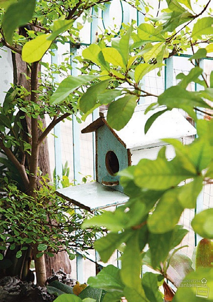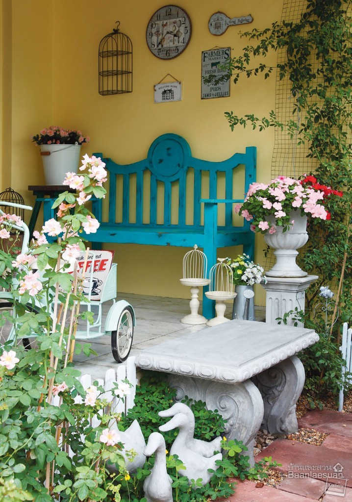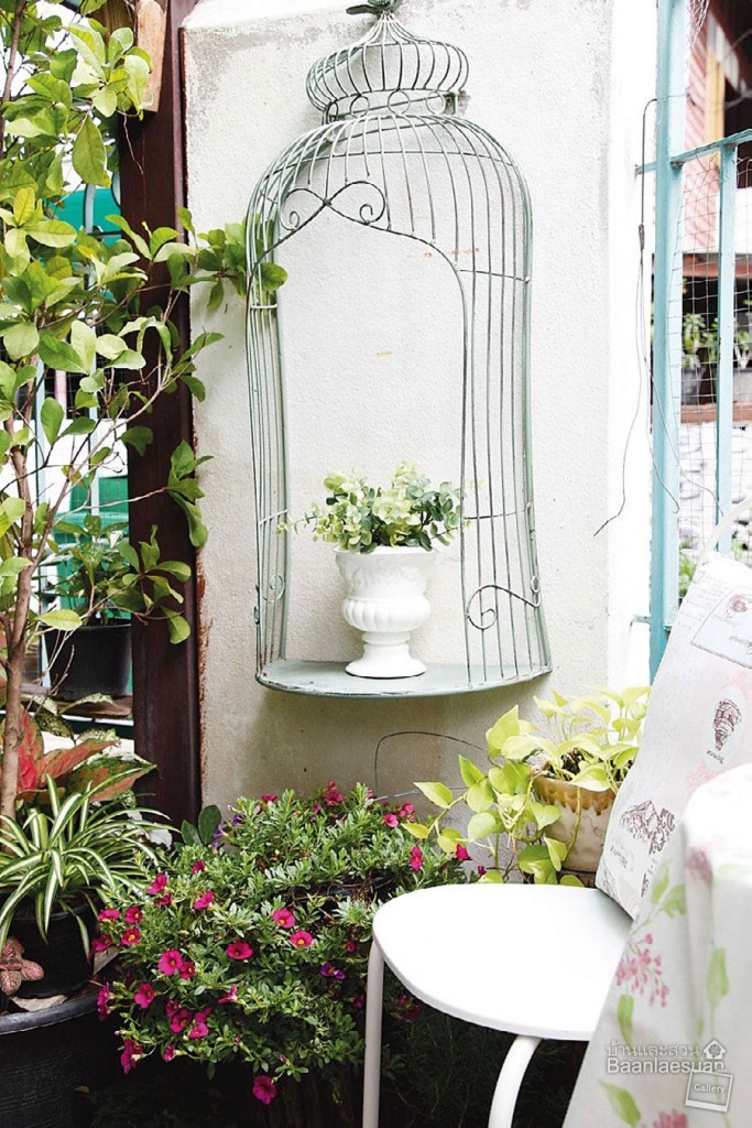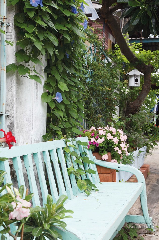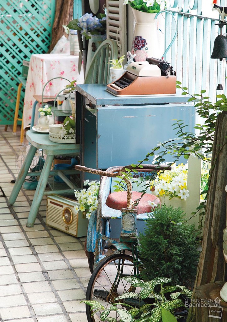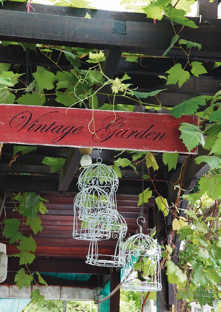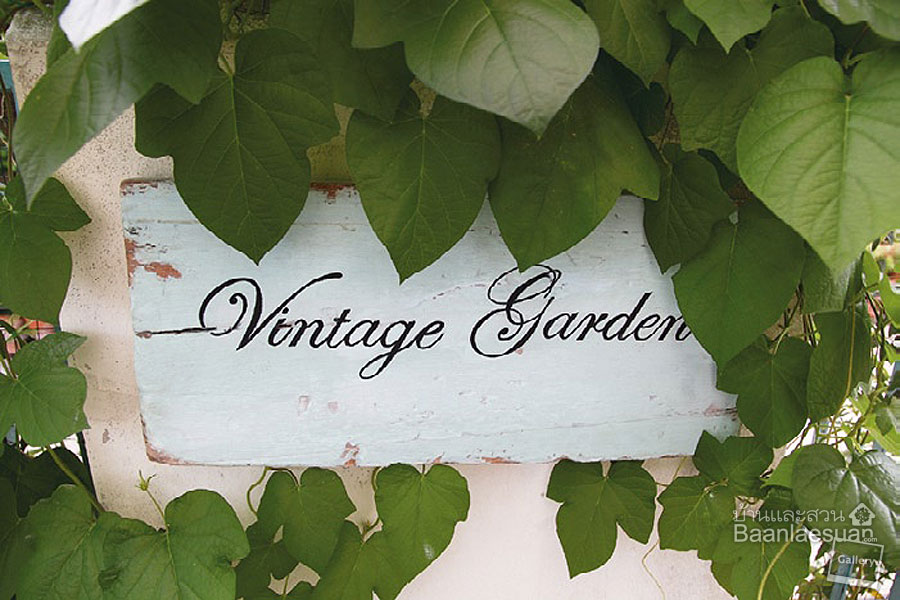“เมื่อก่อนที่บ้านตกแต่งสวนแบบไทยๆ ออกแนวล้านนา” คุณเล็กเริ่มกล่าว “อย่างหน้าบ้านจะให้อารมณ์เหมือนศาลาท่าน้ำ มีเก้าอี้ไม้สัก ไม้แกะสลักติดผนัง ไม้เกวียนแต่งสวนบ้าง เน้นงานไม้เสียเยอะ ต่อมากระแสสวนชื้นเริ่มมา ต้นไม้ในสวนก็จะมีมอสส์เข้ามาเป็นองค์ประกอบ ต้องทำโครงสร้างเพิ่ม มีขึง ซาแรน ติดเครื่องพ่นหมอก แต่สไตล์สวนยังคงเป็นแบบล้านนาเหมือนเดิม พอเวลาผ่านไปสักพัก กระแสสวนวินเทจเริ่มเข้ามา แล้วเราชอบมาก จึงเริ่มเปลี่ยนแปลงทีละเล็กละน้อย ของเก่าเอาไปให้น้องสาวบ้าง ไม้เก่าเอามาทำใหม่บ้าง ก็มีทั้งเดโคพาจ ทาสีใหม่ ทำด้วยตัวเองเลยค่ะไปซื้อจากวัดสวนแก้ว แล้วมาแปลงโฉมในแบบที่เราอยากได้