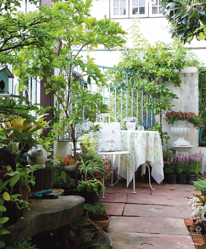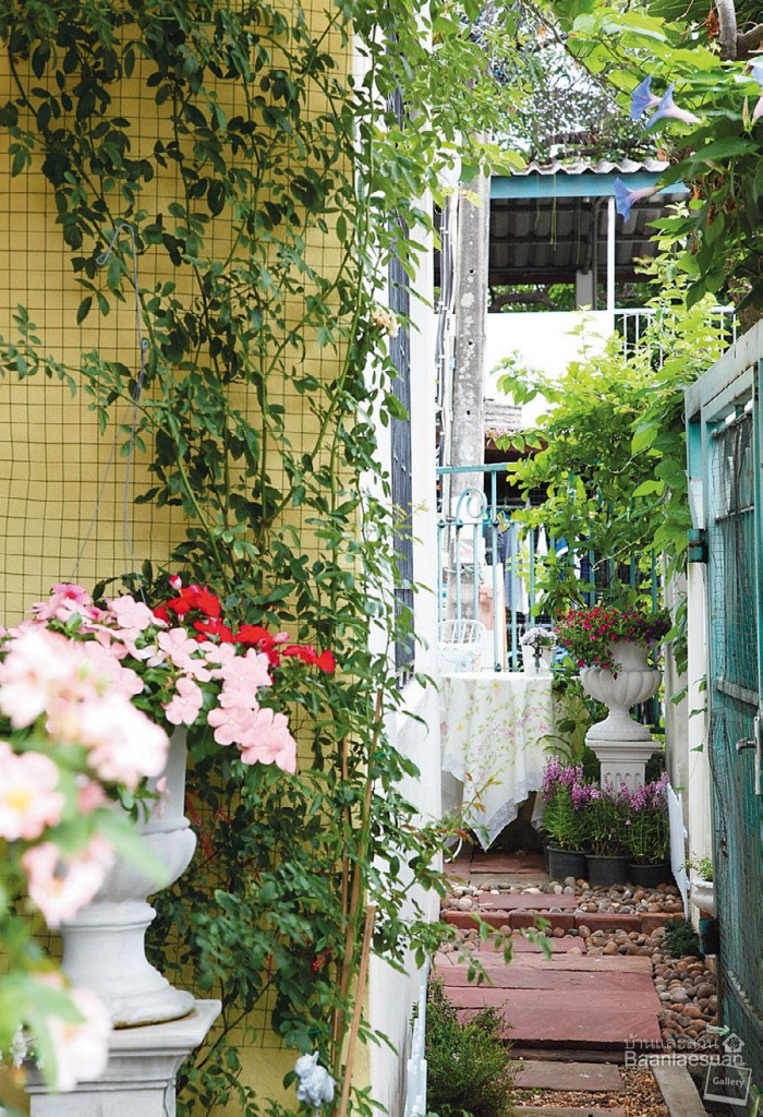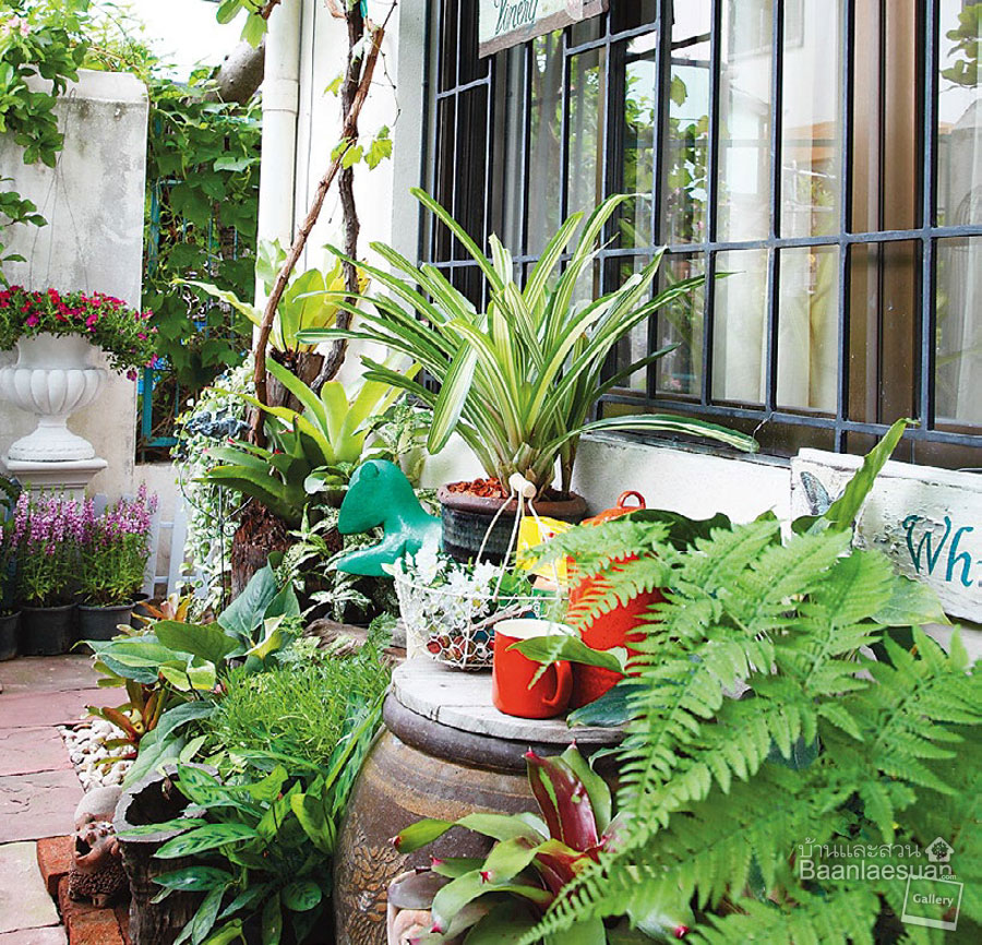 ซึ่งการ จัดสวนเอง ก่อนจะบันดาลใจได้แน่นอนว่าย่อมมาจากความรักความชอบเสียก่อน คุณเล็ก – บุษกรและคุณนนท์ – พิทยา กิจติวรานนท์ ตกหลุมรักสวนแนววินเทจเข้าอย่างจัง ด้วยความชอบจึงอยากมีสวนเล็กๆไว้ในบ้าน ทั้งสองค่อยๆสร้างพื้นที่สีเขียวแทรกตัวไปตามมุมบ้าน แม้มีพื้นที่จำกัดแต่ก็เต็มไปด้วยธรรมชาติในทุกมุมมอง