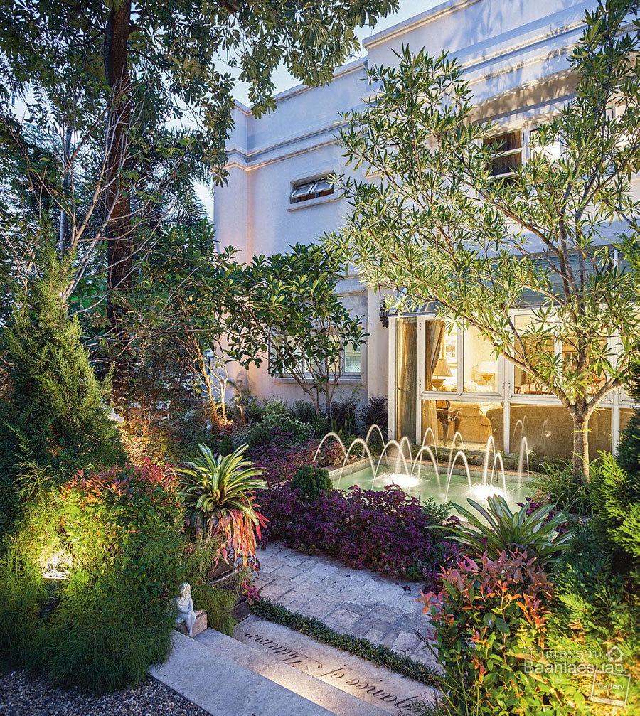 Owners : “สวนเดิมจัดมาประมาณ 10 ปีได้ เป็นสไตล์สวนเมืองร้อนทั่วไปครับ มีสระน้ำ ส่วนหน้าบ้านมีบ่อน้ำเล็กๆ เริ่มต้นคืออยากเปลี่ยนแปลงตรงนี้หน่อย ยังคงบ่อเดิมไว้แต่กรุวัสดุใหม่ทั้งหมด ติดน้ำพุเพิ่ม แล้วใช้ระบบน้ำช่วยให้เราประหยัดน้ำมากขึ้น ส่วนไม้ใหญ่เป็นต้นเดิม มีเอาออกไปบ้าง เช่น จันทน์ผา ลั่นทม เพราะว่าไม่เข้ากับธีมสวน โดยเพิ่มสนฉัตรเข้ามา