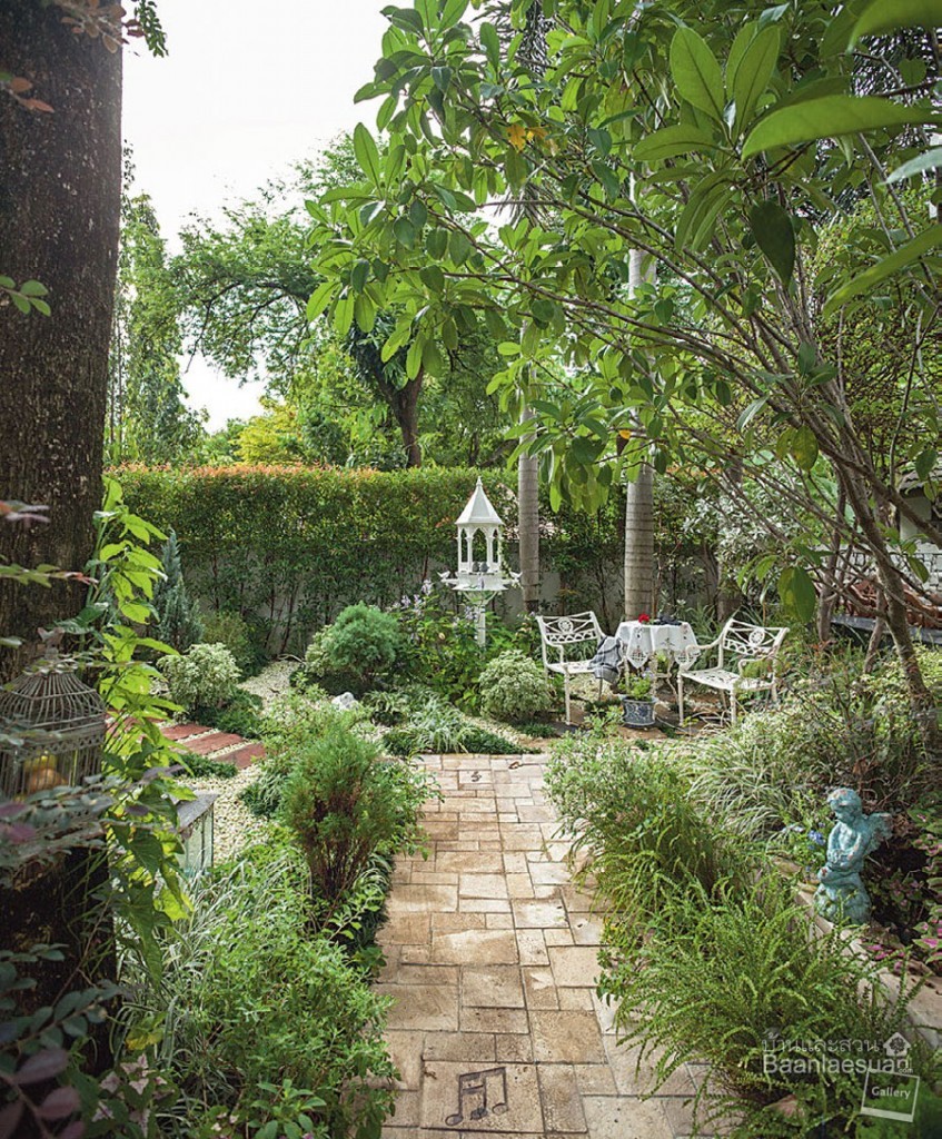สวน 4 ฤดู ท่วงทำนองของไวโอลินอันแสนไพเราะในบทเพลงคลาสสิก The Four Seasons ของ Antonio Vivaldi คีตกวีเอกของโลก นักประพันธ์เพลงคลาสสิกและนักไวโอลินชาวอิตาลี คือแรงบันดาลใจที่ผู้ออกแบบนำมาใช้เป็นโครงเรื่องหลักในการบรรจงถ่ายทอดทุกรายละเอียดลงไปในสวน โดยมีฤดูกาลเป็นตัวกำหนดการจัดองค์ประกอบให้สวนแห่งนี้สวยงามดังที่เห็น คุณภิรมย์ศักดิ์และคุณสุดารัตน์ สาสุนีย์ เจ้าของบ้านหลังนี้ เคยใช้ชีวิตช่วงเวลาหนึ่งในประเทศอังกฤษ รวมถึงลูกๆทั้งสามคนก็เรียนจบจากที่นั่น ทำให้ทั้งสองท่านซึมซับบรรยากาศความงดงามในการตกแต่งบ้านและจัดสวนแบบอังกฤษอยู่ในใจ เมื่อ คุณหนุ่ม – นิติ เศรษฐนันท์ สถาปนิกและนักจัดสวน มีโอกาสเข้ามาออกแบบจัดสวนให้เป็นอย่างที่ทั้งสองท่านชอบ ในที่สุดภาพสวนสวยแสนอบอุ่นเจือกลิ่นอายอังกฤษก็เริ่มต้นขึ้น