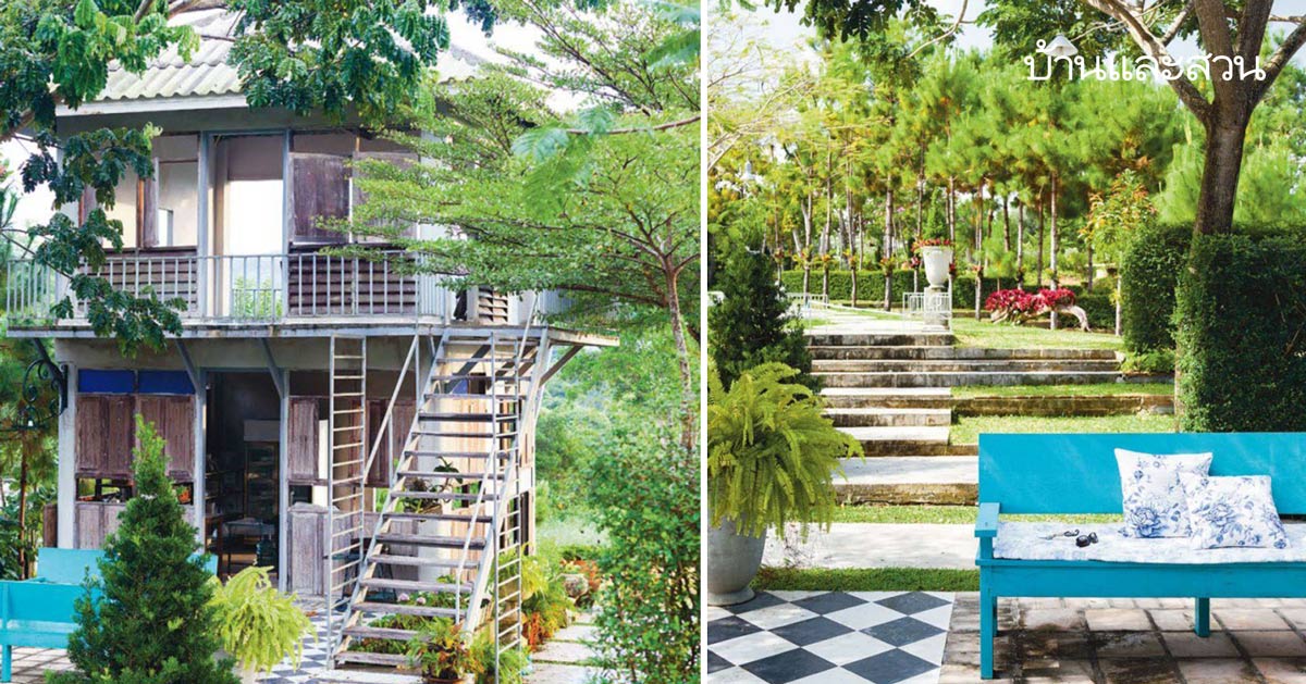 บ้านไม้ 2 ชั้น บนพื้นที่ 6 ไร่ ลักษณะที่ดินมีหน้ากว้างเพียง 40 เมตร แม้ว่าจะค่อนข้างแคบและยาวแบบเส้นก๋วยเตี๋ยว แต่ก็ไม่เป็นปัญหาในการวางแผนจัดสรรและเนรมิตไร่มันสำปะหลังให้กลายเป็นบ้านในสวนอันแสนอบอุ่นและน่าอยู่
