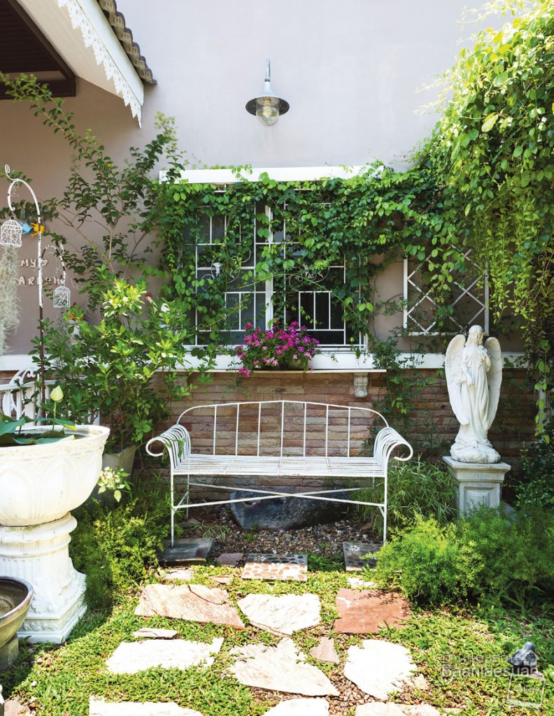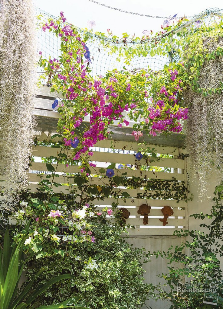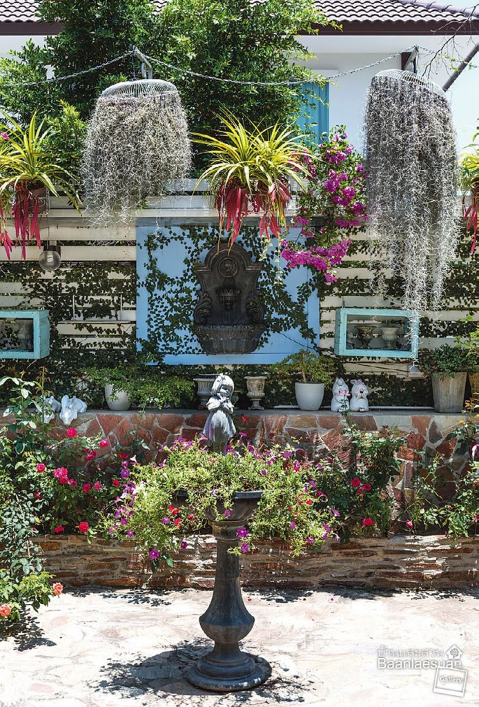 “แรงบันดาลใจในการทำสวนมาจากที่เราชอบการตกแต่งในสไตล์ วินเทจ ชอบสวนอังกฤษ เป็นคนชอบอ่านหนังสือแต่งบ้านมาก คิดมาตลอดว่าถ้ามีบ้านที่มีพื้นที่กว้างๆจะทำสวนแน่นอน เมื่อก่อนเราอยู่บ้านทาวน์เฮ้าส์ พื้นที่ปลูกต้นไม้มีจำกัดมาก ปลูกได้แต่พวกไม้แขวน ซึ่งต่างกับบ้านหลังใหม่ เรามีพื้นที่ค่อนข้างมากทีเดียว บ้านหลังนี้พื้นที่ขนาด 90 ตารางวา สามารถทำสวนได้สบาย สวนที่นี่จะเน้นไม้ดอกเป็นหลัก ตามสไตล์ของสวนอังกฤษ ฉะนั้นไม้ที่นี่จึงเปลี่ยนค่อนข้างบ่อย เราขับรถเข้ากรุงเทพฯเป็นประจำ เพราะลูกสาวกำลังเรียนปริญญาโทอยู่ เวลาเข้าไปส่งลูกสาวที่กรุงเทพฯก็มักซื้อต้นไม้กลับมาด้วยตลอด เพราะทางกลับกาญจนบุรีจะผ่านแถวบางใหญ่อยู่แล้ว ที่เมืองกาญจน์ต้นไม้จะแพง เพราะรับมาจากตลาดแถวบางบัวทอง-บางใหญ่อีกทอด แถมมีให้เลือกน้อย จึงใช้วิธีไปซื้อที่ตลาดต้นทางดีกว่า ตีรถเที่ยวเดียวได้ต้นไม้กลับมาด้วย”