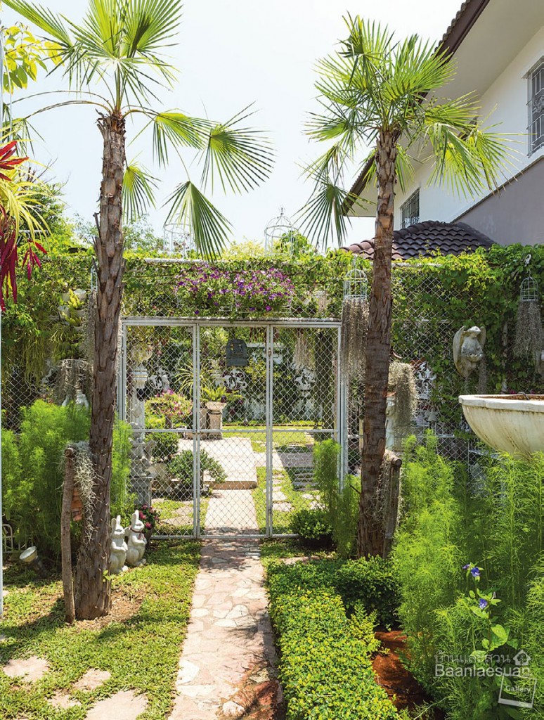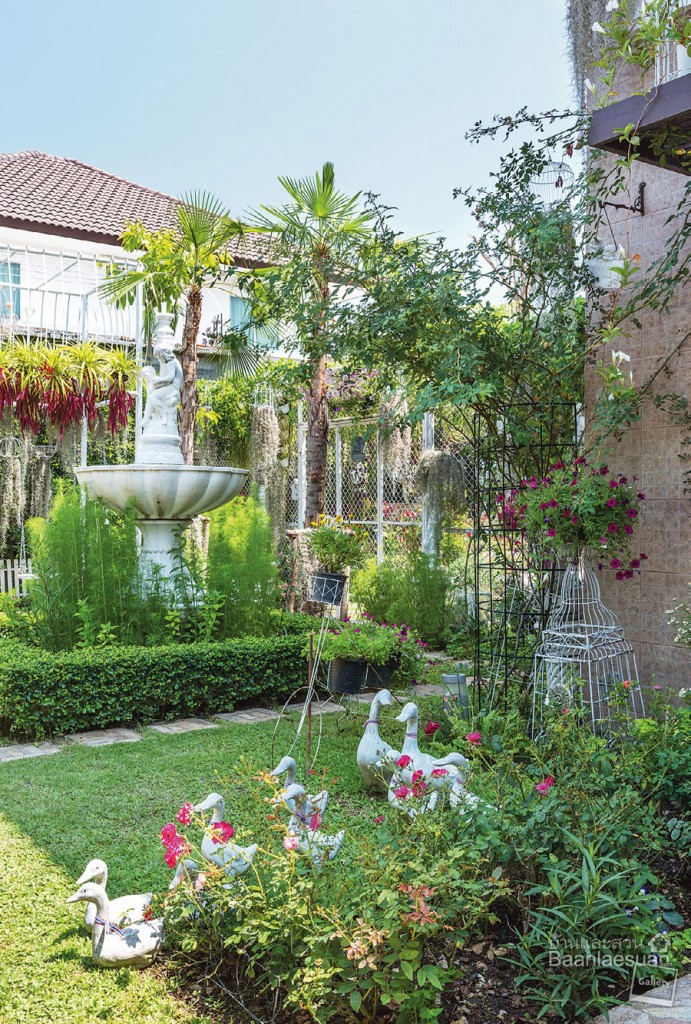 “เราเริ่มทำสวนไปพร้อมกับต่อเติมบ้าน ตอนที่ยังลงต้นไม้ได้ไม่เต็มที่ก็ซื้อพวกน้ำพุ ปูนปั้นต่างๆทยอยเข้ามาก่อน วางเป็นโครงหลักในสวน จากนั้นทางเดินกับต้นไม้ก็ตามมา สวนนี้ทำไปเรื่อยๆ คอยแก้ปัญหาจุดบกพร่องต่างๆ ปัจจัยสำคัญที่กำหนดหน้าตาของสวนนอกจากสไตล์อังกฤษแล้ว ก็คือ ‘แมว’ ที่บ้านเลี้ยงแมวมาตั้งแต่เริ่ม และเราเป็นคนรักแมวมาก ไม่อยากให้เดินเพ่นพ่านไปที่อื่น แต่ก็จะห้ามยาก เพราะแมวเป็นสัตว์ซุกซุน ชอบปีนป่าย การทำสวนจึงต้องปรับไปตามการอยู่อาศัยของแมวด้วย ที่บ้านจะเลี้ยงแมวอยู่ภายในสวน ไม่ชอบเลี้ยงในกรงแคบๆ สังเกตได้ว่าจะทำรั้วล้อมรอบบ้านค่อนข้างสูงและใช้ต้นเหลืองชัชวาลย์เลื้อยคลุมเพื่อพรางโครงลวดกับตาข่ายให้ดูกลมกลืน ต้นไม้ที่สูงและติดรั้วจะปลูกไม่ได้เพราะแมวจะพยายามปีนออก แต่ก็ถือเป็นข้อดี เพราะสนามหญ้าและไม้ดอกต่างๆก็ได้รับแสงแดดเต็มที่”