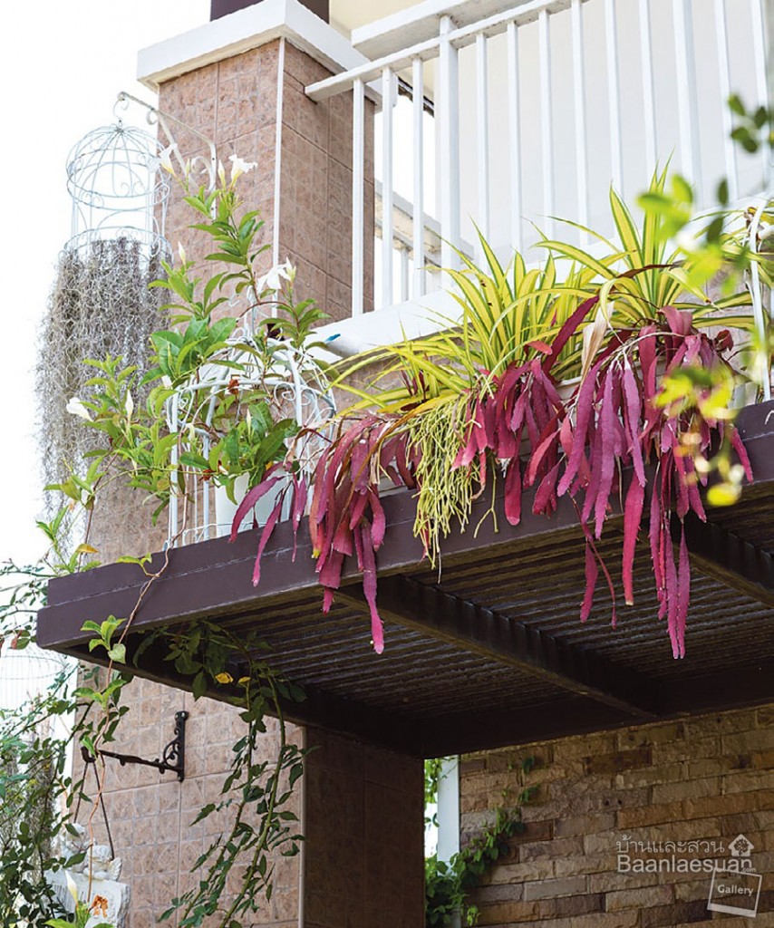 “ตอนมาอยู่แรกๆ ภายในหมู่บ้านจะไม่ค่อยเห็นบ้านไหนทำสวนจริงจัง เรียกได้ว่าเราเป็นบ้านแรกๆเลยที่จัดสวนเต็ม และด้วยความที่บ้านเราอยู่ตรงสามแยก แถมยังเป็นบ้านที่อยู่สุดเนินถนนพอดี เลยยิ่งทำให้บ้านดูเด่น ใครเห็นก็จะเข้ามาถามไถ่ ชื่นชมเรื่องสวนในบ้านค่อนข้างบ่อย จนหลายบ้านพากันปลูกต้นไม้มากขึ้น โดยส่วนตัวแล้วดีใจที่ได้เป็นแรงบันดาลใจให้คนในหมู่บ้านทำสวนกันมากขึ้น บ้านตรงข้ามเรานี่ก็จัดสวนสวย พากันไปซื้อต้นไม้บ่อยๆ โดยเราจะแลกเปลี่ยนต้นไม้กันบ้าง แบ่งปันเรื่องเคล็ดลับการดูแล โชคดีที่บ้านของเรารายล้อมด้วยคนที่ชอบปลูกต้นไม้เหมือนๆกัน”