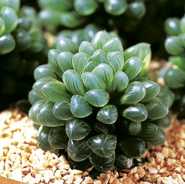 ลำต้นสั้น เจริญเป็นพุ่มกลม เส้นผ่านศูนย์กลาง 4 – 7 เซนติเมตร ใบคล้ายรูปไข่ ออกเวียนรอบต้นเป็นกระจุกแน่น กว้าง 1 – 1.2 เซนติเมตร ยาว 2 – 2.5 เซนติเมตร ปลายใบแหลม แผ่นใบหนาแผ่กางออก สีเขียว มีลายริ้วสีเขียวเข้มพาดราง ๆ ช่อดอกเป็นช่อกระจะ ออกตามซอกใบใกล้ปลายยอด ชูสูง ก้านช่อดอกเรียวเล็ก ดอกสีขาว กลีบดอกเชื่อมติดกันเป็นหลอดเล็ก ๆ