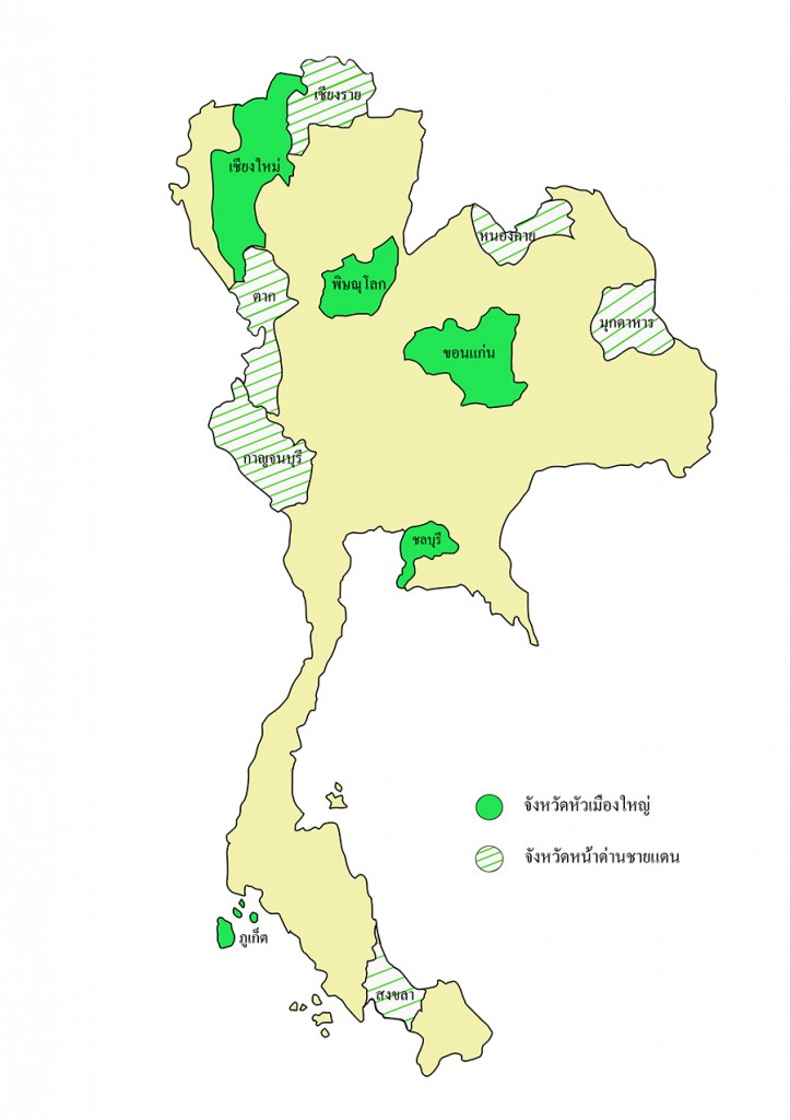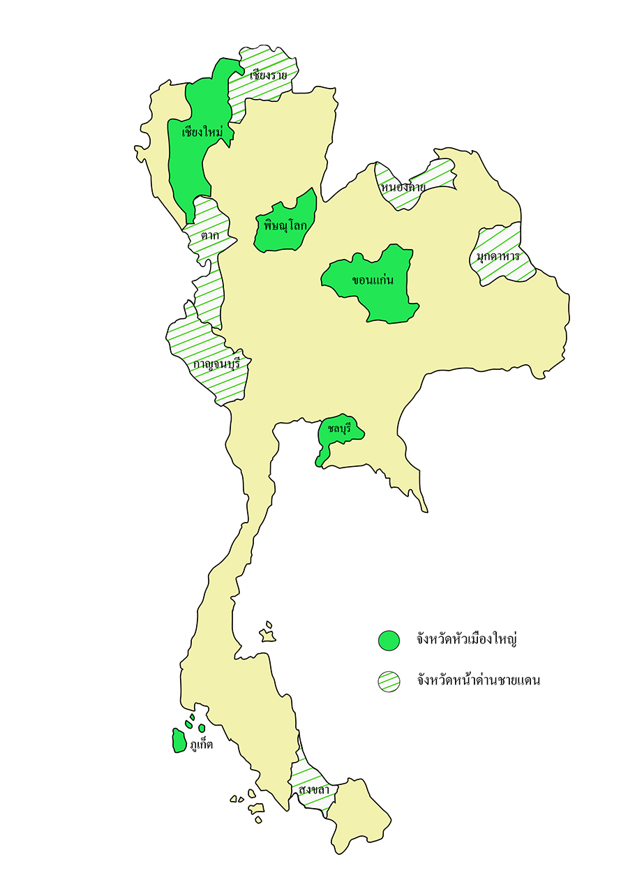 2. จังหวัดหน้าด่านชายแดน มี 6 จังหวัด ได้แก่ สงขลา เชียงราย ตาก มุกดาหาร หนองคาย และกาญจนบุรี