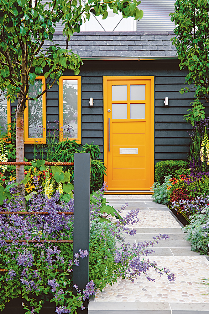 แม้จะมีพื้นที่ว่างหน้าทาวน์เฮ้าส์ไม่มาก แต่สามารถสร้างจุดสนใจให้สวนได้ด้วยสีสันละลานตาของพรรณไม้ดอก ชวนให้นึกถึงบรรยากาศแบบสวนชนบทอังกษ อีกทั้งยังแต่งแต้มสีสันบนบานประตูและหน้าต่างของบ้านใช้เป็นฉากรับสายตา ทำให้มุมสวนหน้าบ้านที่ดูธรรมดาสะดุดตากว่าใคร