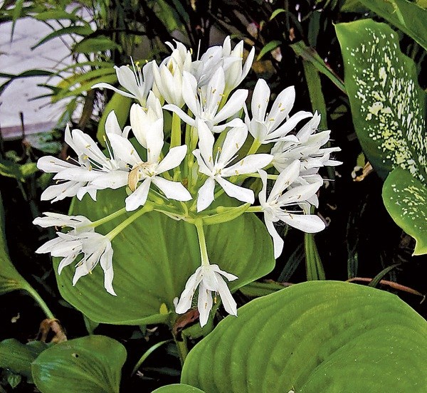 - ดอก: ช่อดอกออกจากเหง้า เกิดก่อนหรือพร้อมกับผลิใบ ช่อยาวประมาณ 10 เซนติเมตร ดอกสีขาวกลีบปากสีเหลือง โคนสีน้ำตาลแดงออกเป็นช่อซี่ร่มออกจากซอกกาบใบ แต่ละช่อมี 10 – 20 ดอก กลีบรวมเชื่อมติดกัน เกสรเพศผู้ 6 อัน ปลายแยกเป็น 6 กลีบ สีขาว ออกดอกเดือนมีนาคม-พฤษภาคม