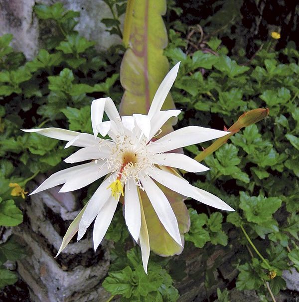 - ดอก: รูปแตร ยาว 15 – 20 เซนติเมตร กลีบรวมเรียวแหลม สีขาวนวล เกสรเพศผู้จำนวนมาก สีเหลือง เกสรเพศเมียสีชมพู ออกดอกดกในฤดูฝน บานตั้งแต่ช่วงใกล้ค่ำถึงช่วงเช้าของวันรุ่งขึ้น บานเพียงวันเดียว จากนั้นจะร่วงไป