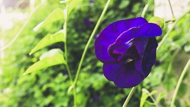 - ดอก : ออกเป็นช่อกระจะห้อยลงมาตามซอกใบหรือตามข้อ แต่ละช่อมี 3 – 4 ดอก ใบประดับสีขาว มีจุดประสีแดง ดอกขนาดใหญ่รูปแตร ปลายดอกแยกเป็น 5 กลีบ สีม่วงอ่อน สีฟ้าหรือสีขาว ภายในดอกมีเกสรเพศผู้ 4 อัน เมื่อดอกร่วงจะติดฝักตรงปลายแหลมคล้ายปากนก