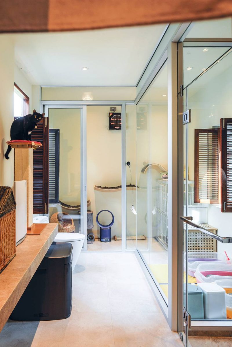 ชั้น 2 ประกอบด้วยห้องนอนหลักเเละห้องนอนเเขก ซึ่งได้กลายเป็นพื้นที่ของเหล่าเเมวทั้ง 5 ตัวไปเเล้วเรียบร้อย รวมถึงมีพื้นที่นั่งเล่นหรือแฟมิลีรูมสำหรับนั่งพักผ่อนหย่อนใจ เเละพื้นที่ระเบียงนั่งเล่นภายนอก การทำช่องเปิดขนาดใหญ่จึงไม่มีความจำเป็นมากนักสำหรับพื้นที่ส่วนตัว สถาปนิกจึงออกแบบช่องเปิดของชั้น 2 ให้มีขนาดเล็กลง เเละเลือกใช้บานไม้เเทนการใช้อะลูมิเนียม เพื่อให้บรรยากาศมีกลิ่นอายความเป็นพื้นถิ่นเจืออยู่