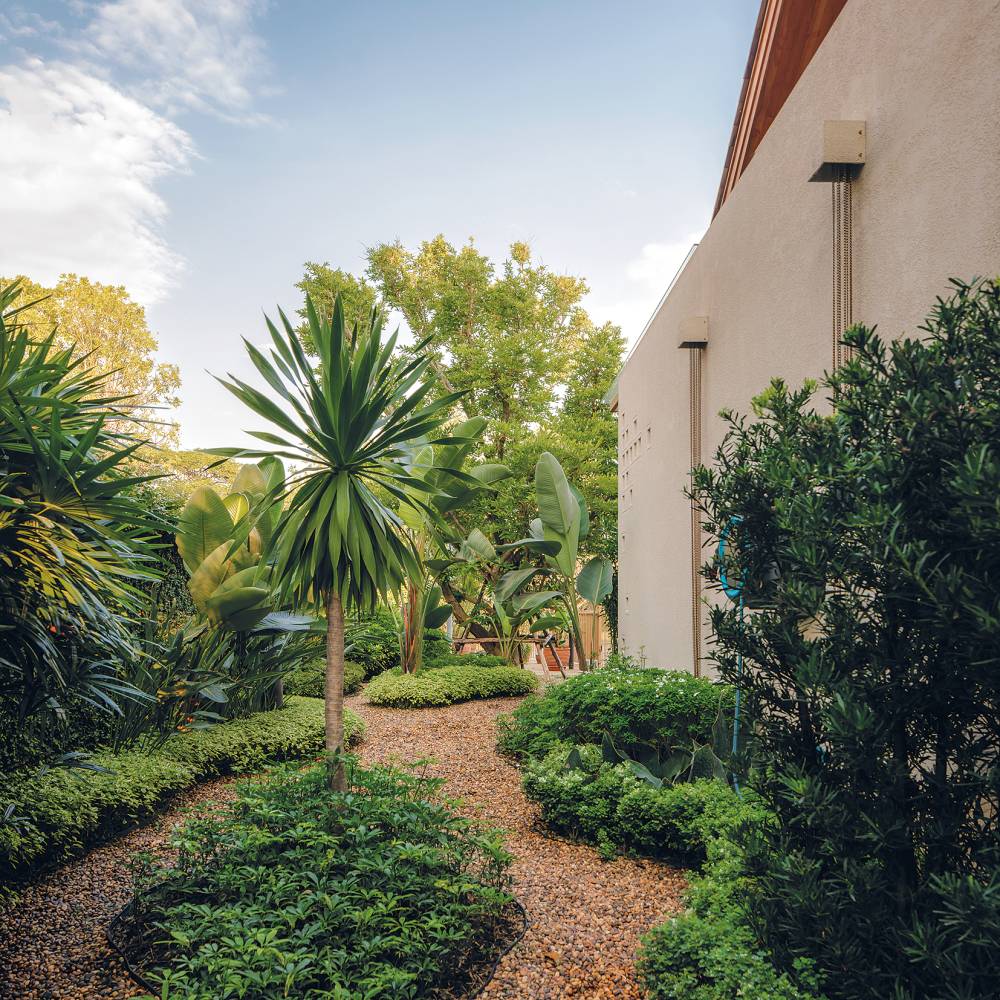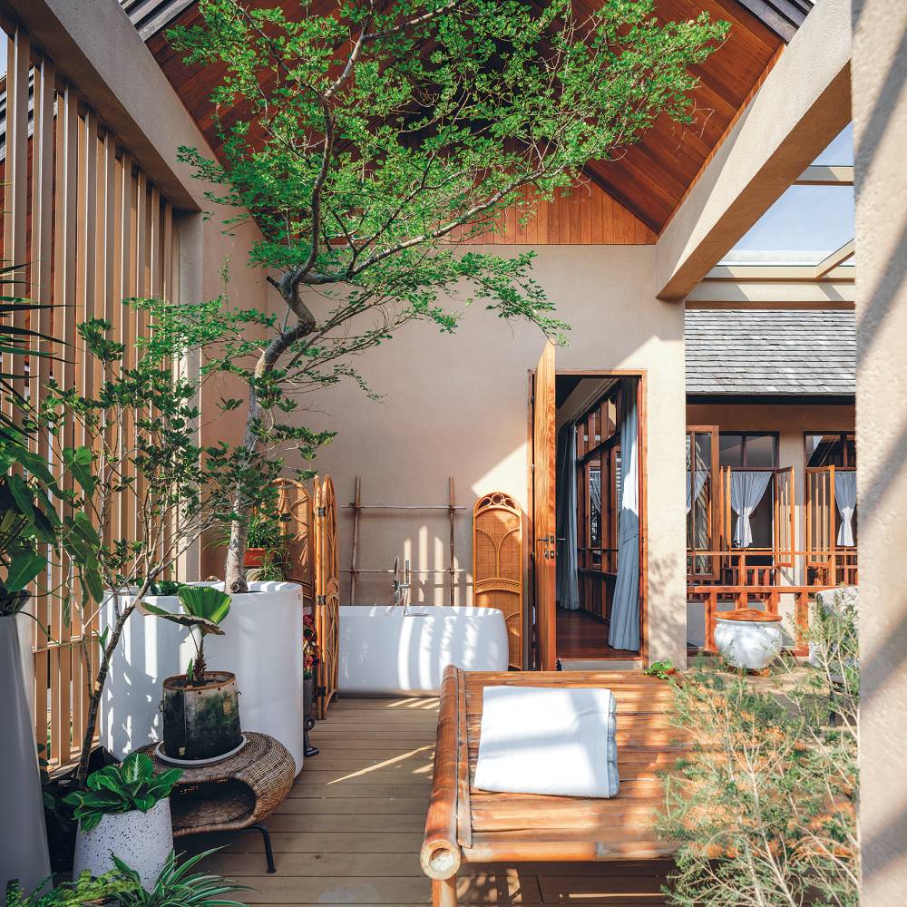 พื้นที่คอร์ตเดิมสถาปนิกยังคงเก็บไว้เเละปรับเปลี่ยนให้กลายเป็นสวนสไตล์ทรอปิคัล ปลูกต้นไม้ประเภทร้อนชื้นอย่างเฟิน กก จั๋ง เฮลิโคเนีย เพื่อช่วยสร้างบรรยากาศของป่าฝน การออกแบบช่องเปิดของชั้น 1 จึงทำบานเปิดที่สามารถเปิดโล่งได้มากเพื่อรับลม เเสงแดด เเละวิวสวน ให้สอดคล้องไปกับพื้นที่ชานนั่งเล่นรอบบ้าน บานเลื่อนอะลูมิเนียมจึงเป็นตัวเลือกที่เหมาะสม เนื่องจากสามารถเปิดได้กว้างเต็มที่ และคุมโทนสีอ่อนของผนังและเฟรมอะลูมิเนียมสีเทาอ่อน