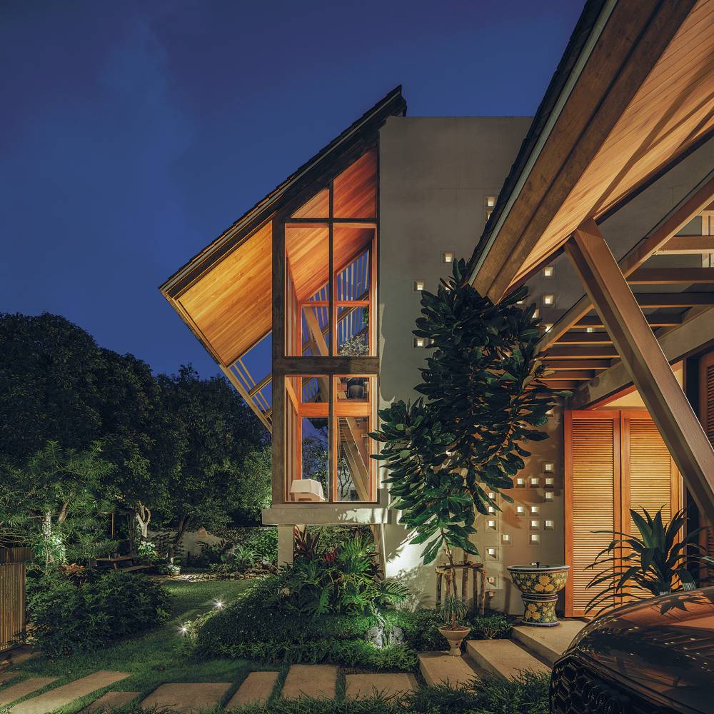 สิ่งที่ขาดไปไม่ได้เเละช่วยสร้างภาพรวมของบ้านให้มีกลิ่นอายบ้านทรอปิคัลได้อย่างเต็มที่นั่นก็คือหลังคา ซึ่งสามารถมองเห็นได้ชัดเจนจากมุมมองฝั่งหน้าบ้าน สถาปนิกเก็บโครงสร้างเดิมไว้ เเละเปลี่ยนเพียงวัสดุมุงหลังคาเป็นแผ่นหลังคาไม้ซีดาร์ เพื่อสร้างบรรยากาศภาพรวมของบ้านให้ดูอบอุ่น สบายตา จากการเเต่งเติมด้วยสีสันจากธรรมชาติ