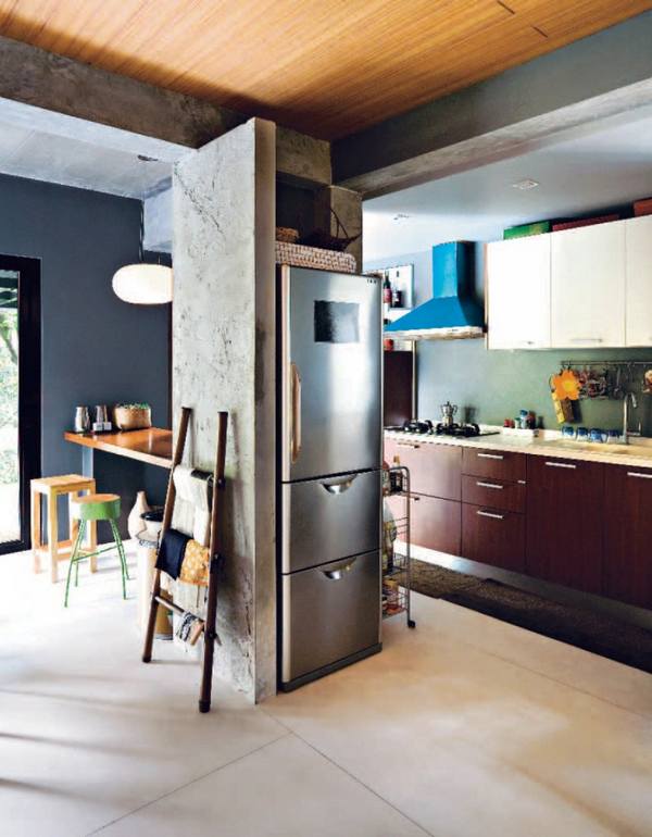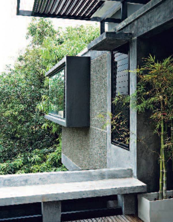 “ผมเลือกใช้อิฐมวลเบามาก่อเป็นผนังแทนอิฐมอญทั่วไป เพราะก่อสร้างได้เร็วกว่า น้ำหนักเบากว่า ช่วยลดน้ำหนักของตัวบ้าน แถมยังช่วยกันความร้อนได้ดีกว่าด้วย ส่วนกระจกที่ใช้เป็นกระจกใสธรรมดา ไม่ใช่กระจกตัดแสง เพื่อให้แสงธรรมชาติสามารถส่องเข้ามาได้อย่างทั่วถึง แต่จะมีการออกแบบครีบรอบบานกระจกเป็นกล่อง เพื่อช่วยบังแสงแดดไม่ให้เข้ามามากเกินไป แถมครีบเหล่านี้ยังเป็นเหมือนท่อดูดลมให้เข้ามาภายในบ้านมากขึ้นด้วย บ้านจึงเย็นสบายเพียงแค่เปิดประตูหน้าต่าง ในส่วนที่เป็นผนังคอนกรีตขัดมันจะผสมสีดำเข้าไปเล็กน้อย เพื่อให้สีเทาของคอนกรีตนั้นเข้มขึ้น ดูแตกต่างจากงานคอนกรีตทำผิวขัดมันแบบทั่วไปที่เคยเห็นกัน แถมยังดูกลมกลืนกับสีของลำต้นมะม่วงด้วย”