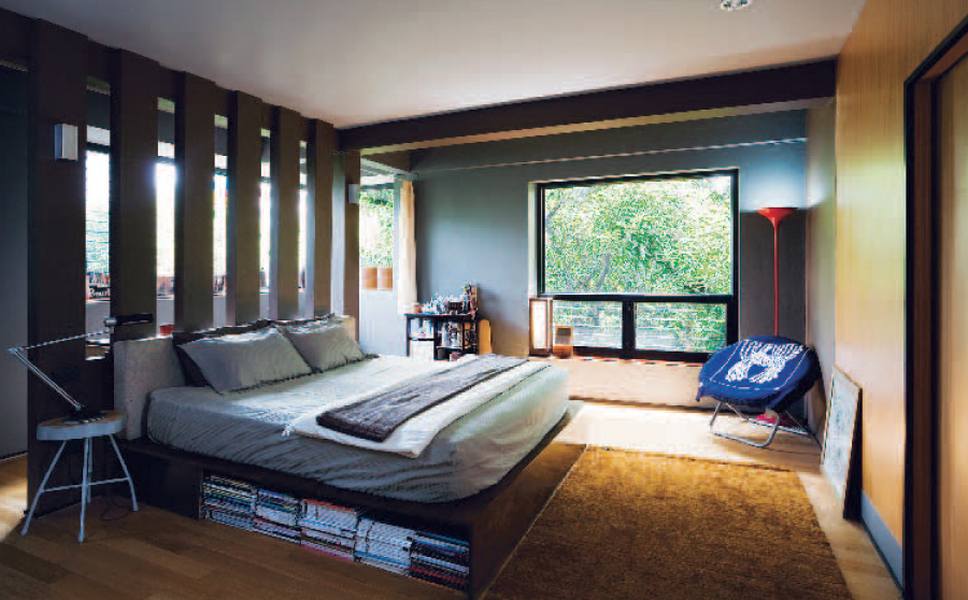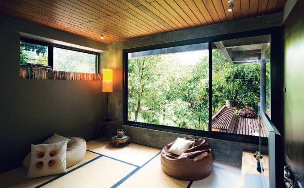 “ถ้าสังเกตเราจะรู้สึกว่าบ้านหลังนี้มีกลิ่นอายของความเป็นญี่ปุ่นผสมอยู่ด้วย ไม่ว่าจะเป็นพื้นที่ชั้นหนึ่งซึ่งเป็นใต้ถุนโล่ง สามารถมานั่งพักผ่อนบนชุดเฟอร์นิเจอร์ไม้สไตล์ญี่ปุ่น ฉากหลังเป็นระแนงไม้ซี่บางประกอบกันเป็นตาราง บวกกับด้านข้างเป็นพื้นที่ลดระดับลงไปและโรยกรวด ส่วนชั้นสองของบ้านมีห้องญี่ปุ่นขนาด 7 เสื่อทาทามิ แต่เราก็คำนึงถึงการใช้งานสะดวกด้วย จึงออกแบบให้พื้นบางส่วนเป็นคอนกรีต เพราะทำความสะอาดง่ายกว่าพื้นเสื่อ นอกจากนี้ผมยังออกแบบห้องเผื่อไว้สำหรับญาติของไมโกะซึ่งมาจากญี่ปุ่นด้วย มาทีหนึ่งก็หลายคน บางห้องจึงเป็นเพียงห้องว่างเปล่า มีห้องน้ำในตัว”