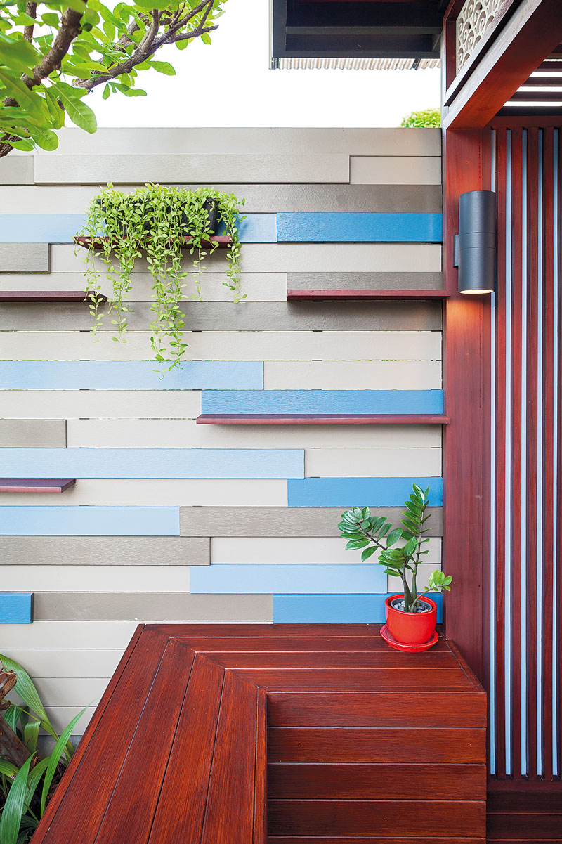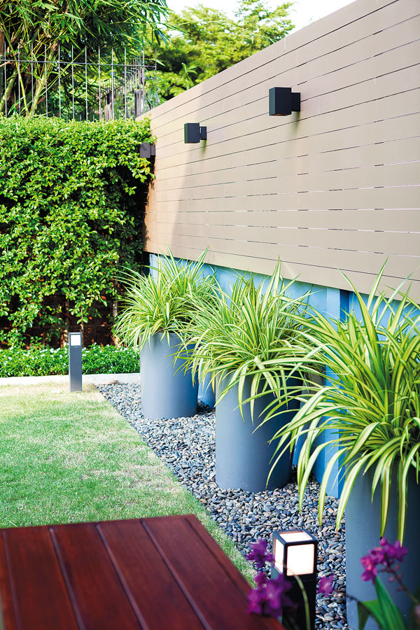 “ผมเคยจัดสวนของบ้านหลังนี้มาแล้วครั้งหนึ่ง พอผ่านไป 5 ปี ก็ได้เข้ามาปรับปรุงใหม่ เป็นการจัดสวนครั้งที่สอง โดยมีรูปแบบสวนสไตล์โมเดิร์นทรอปิคัลตามความชอบของคุณเบิ้ลและคุณป้อม เน้นการออกแบบสวนแบบเรียบสวย มีพื้นที่โปร่ง และดูแลง่าย สำหรับครั้งนี้ก็ยังคงคอนเซ็ปต์เดิม เพิ่มเติมคือเรื่องสีสัน และปรับฟังก์ชันใหม่ให้สะดวกต่อการใช้งานมากขึ้น โดยออกแบบพื้นที่ด้านหน้าเป็นสนามหญ้าเปิดสเปซโล่งๆ เดิมทีมีศาลาอยู่ด้านหลัง แต่เมื่อได้ใช้งานจริง เจ้าของบ้านอยากปรับตำแหน่งมาไว้ตรงกลาง ซึ่งเชื่อมต่อมาจากตัวบ้าน เพราะใช้งานสะดวกกว่า ในตอนแรกจะยกศาลาเดิมมาวางตรงมุมนี้ แต่ด้วยขนาดที่ไม่ลงตัวจึงต้องออกแบบศาลาใหม่ ดีไซน์ของศาลาเน้นความโปร่งเพื่อเปิดรับลม ส่วนถัดมาเป็นผนังน้ำตก แล้วทำเดคไม้เล็กๆ เชื่อมต่อไปยังสวนหลังบ้าน ซึ่งสามารถวางบีนแบ็กหรือเบาะนั่งเล่นเอกเขนกอยู่กับพื้น ใกล้ๆกันมีผนังน้ำล้น หากมองจากห้องนั่งเล่นก็จะเห็นผนังน้ำล้นเป็นมุมรับสายตาอย่างพอดิบพอดี