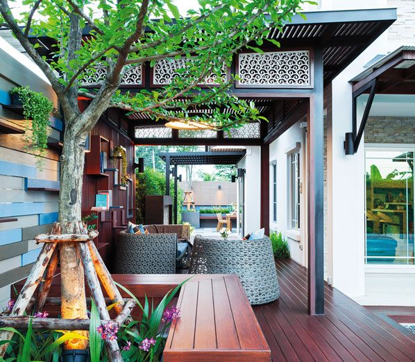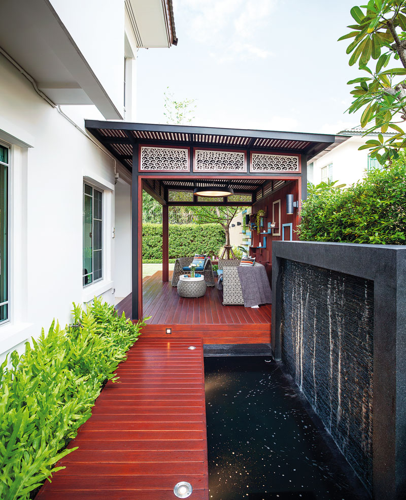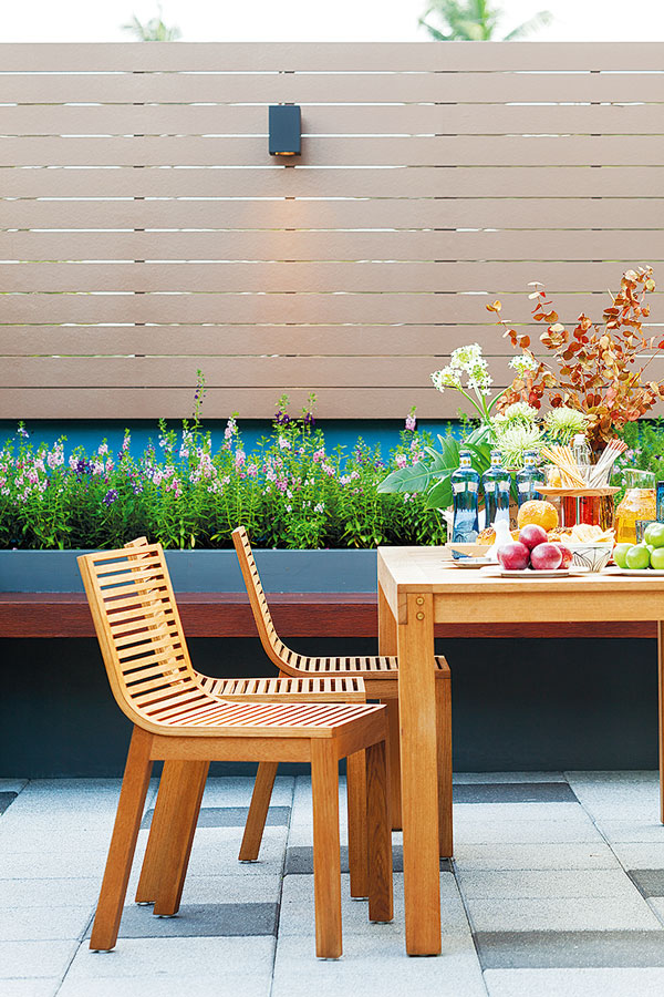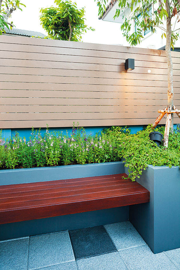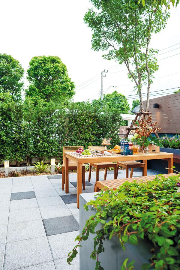 “สวนด้านหลังทำเป็นลานกิจกรรมต่างๆ พื้นสวนปูแผ่นพื้นคอนกรีตสำเร็จรูป ตรงกลางจัดวางชุดโต๊ะเก้าอี้ไม้สไตล์โมเดิร์น และทำม้านั่งยาวบิลท์อินขนานคู่กับกระบะปูนขนาดใหญ่ที่ทำไว้สำหรับปลูกไม้ดอกและไม้ยืนต้น จึงได้อารมณ์คล้ายสวนดาดฟ้า ซึ่งกำแพงสวนนี้ค่อนข้างเตี้ย จึงปลูกไม้พุ่มอย่างไทรเกาหลีช่วยพรางสายตา บางส่วนกรุระแนงไม้เพิ่มความสูงให้พื้นที่ภายในสวนเกิดความเป็นส่วนตัวมากยิ่งขึ้น