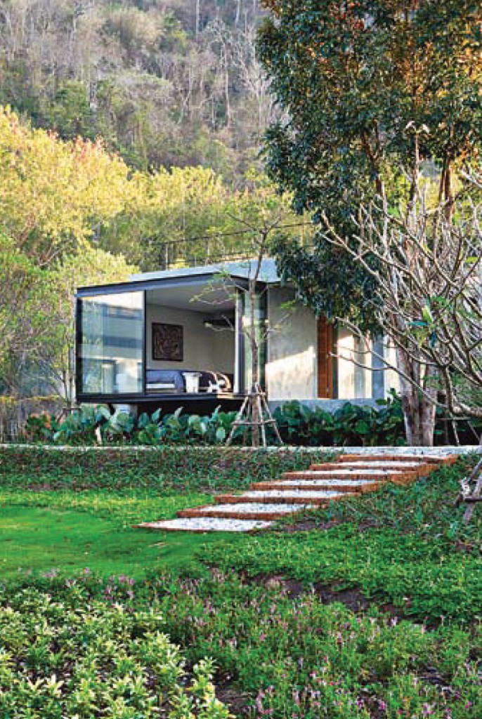 “ที่ดินผืนนี้สวยและมีความเฉพาะตัวตรงที่ เป็นทุ่งหญ้ากว้าง มีต้นขี้เหล็กขึ้นเป็นแถวๆ และโอบล้อมด้วยภูเขาโดยรอบ ต้องการให้บ้านส่งเสริมลักษณะเด่นนี้ไว้ จึงออกแบบวางผังให้แผ่กว้างออกในแนวราบให้มากที่สุด ย่อยพื้นที่ห้องต่างๆออกเป็นเรือนหลังเล็กหลายๆหลัง แทรกด้วยพื้นที่สีเขียวและเชื่อมกันด้วยทางเดินภายนอกแคบ ๆ ซึ่งเวลาเดินผ่าน ก็ให้ความรู้สึกเหมือนกำลังเดินข้ามสะพานเพื่อไปมาหาสู่กัน