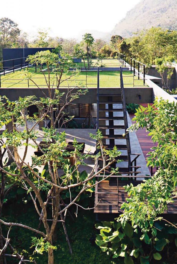 การเลือกใช้วัสดุของบ้านหลังนี้เน้นที่ดูแล รักษาง่าย รวมถึงมีขนาดกะทัดรัด เพราะเป็นบ้านหลังที่สองใช้งานเฉพาะช่วงวันหยุดเท่านั้น แต่สถาปนิกก็ไม่ลืมสร้างพื้นที่ส่วนกลาง เช่น การรวมเอาส่วนนั่งเล่น ครัว และส่วนรับประทานอาหารไว้ด้วยกัน การจัดวางระเบียงไม้ขนาดใหญ่ ชานกว้าง และสระว่ายน้ำเป็นศูนย์กลางของบ้าน และส่วนดาดฟ้าที่ออกแบบให้ปูหญ้าเทียมน่าเข้าไปใช้งาน