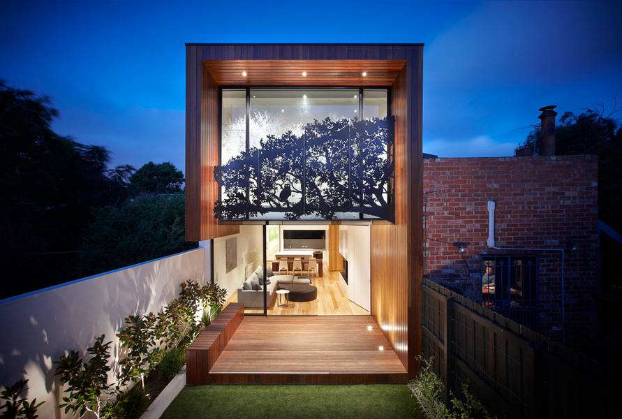 บ้านโมเดิร์นอีกหลัง ที่มีรูปดีไซน์ เก๋แปลกตา กับลักษณะของบ้านทรงกล่อง มีตัวบ้านที่ทอดยาวลึกเข้าไป บริเวณหน้าบ้านเป็นเดคไม้ รวมไปถึงผนังไม้ที่ทำยาวขึ้นไปเป็นโครงด้านบน พร้อมภาพกราฟฟิคที่เป็นรูปต้นไม้ ให้ความรู้สึกเหมือนเป็นกิ่งก้านของต้นไม้ที่ยื่นออกมาจากผนังบ้าน