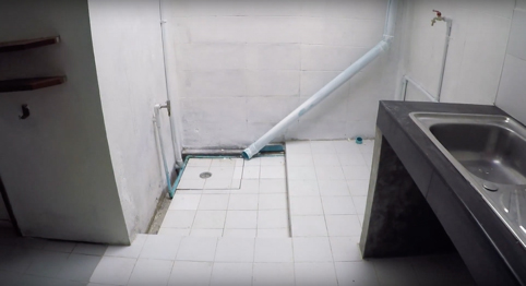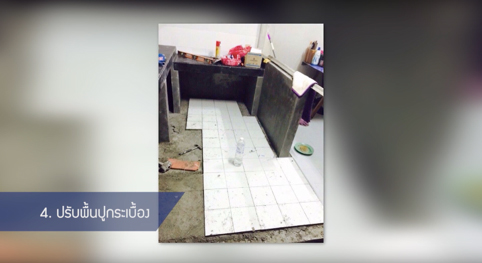 4. ปรับพื้นปูกระเบื้องใหม่ เทพื้นปูกระเบื้อง โดยมีการลดระดับหลุมส่วนซักล้างให้น้าไม่นองไปยังพื้นที่อื่น