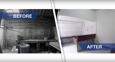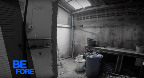 2. ซ่อมแซมโครงสร้างผนังใหม่ จากเดิมที่เพียงหาวัสดุมาบังกันฝนสาดนั้นก็ปรับเปลี่ยนใหม่เป็นกาแพงก่อขึ้นไปจนเต็มและฉาบปูนให้เรียบร้อย
