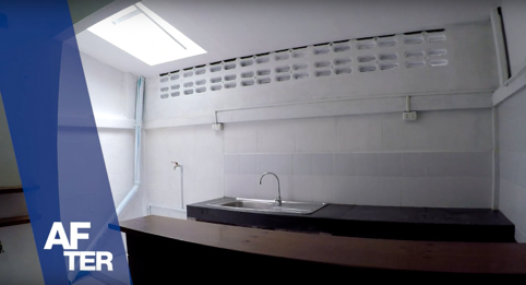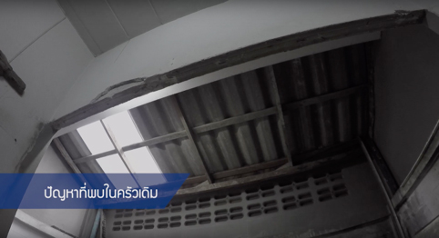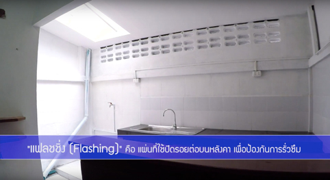 1. ซ่อมแซมหลังคาใหม่ จากเดิมที่ปัญหาการรั่วเริ่มจากตรวจเช็คกระเบื้องและหารอยรั่วรวมถึงทา “แฟลชชิ่ง(Flashing) หรือแผ่นปิดรอยต่อเพื่อป้องกันการรั่วซึมรวมทั้งทาช่องแสงเพิ่มเพื่อให้แสงธรรมชาติส่องลงมายังพื้นที่ซักล้างได้โดยสะดวก เพราะว่าถ้าครัวมืดทึบจะทาให้เกิดความอับชื้น