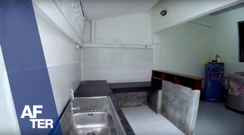 3. ก่อปูนทาเคาน์เตอร์ครัวใหม่ โดยก่อปูนไว้รอรับซิงค์ล้างจานและเว้นที่เพื่อติดตั้งเตาแก๊ซ