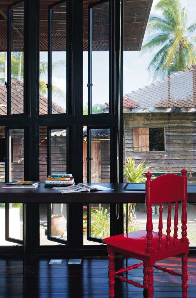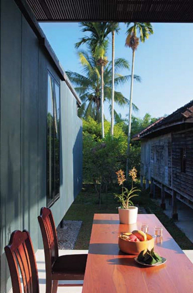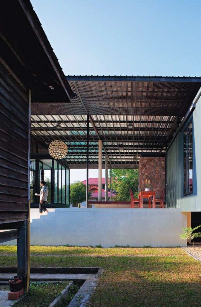 “การใช้หลังคาสองชั้น การวางผังแบบกระจายตัวเชื่อมต่อกันด้วยระเบียงภายใต้หลังคาขนาดใหญ่ ทำให้บ้านมีลมพัดผ่าน อากาศจึงเย็นสบายตลอดทั้งปี โดยแทบไม่ต้องใช้เครื่องปรับอากาศเลย” เสียงสถาปนิกเล่าขณะพาเราเดินเข้าไปในบ้านไม้หลังเก่า