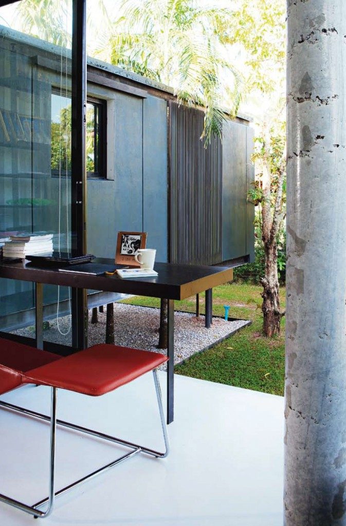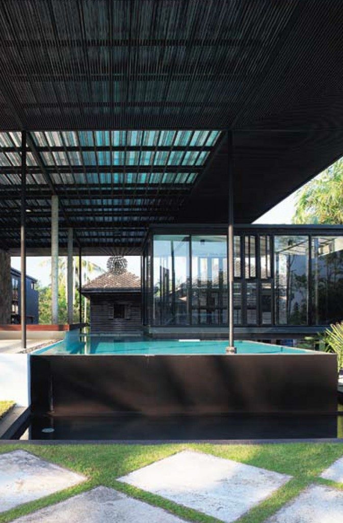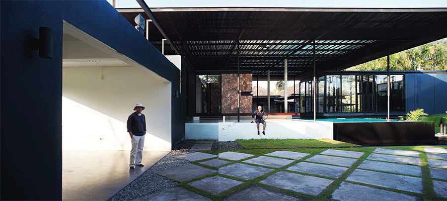 “อยากให้ภาพรวมของบ้านโปร่งและสบายมากที่สุด เลยคุยกันว่าจะทำอย่างไร ก็สรุปว่าจะใช้เสาเล็กแต่หลายต้นหน่อยเพื่อความแข็งแรง ทำหลังคาสองชั้นและยื่นยาวที่สุดเท่าที่จะทำได้ การใช้เสาเหล็กแทนคอนกรีตในบางส่วน และการเก็บต้นไม้ที่มีอยู่ในพื้นที่เดิมให้มากที่สุด ถ้าตรงกับบ้านก็ให้ต้นทะลุขึ้นมากลางบ้านเลย” เรามาหยุดอยู่ที่ระเบียงของบ้านริมสระว่ายน้ำ ซึ่งมีสายลมพัดโชยตลอดเวลา