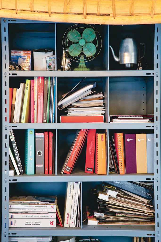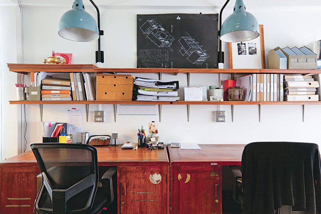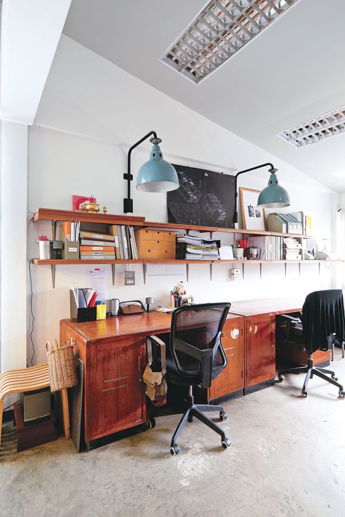 โต๊ะไม้เก่า เดิมใช้ในห้องพักครูนำมาใช้แทนโต๊ะทำงาน ส่วนโคมไฟเก่านำมาออกแบบขาใหม่ให้ติดกับผนังได้สวยงามลงตัว รับกับชั้นวางของและผนัง