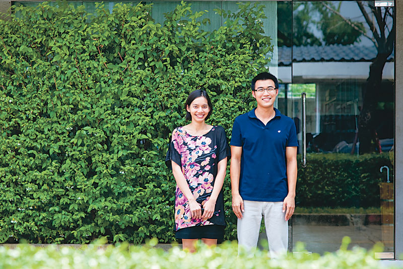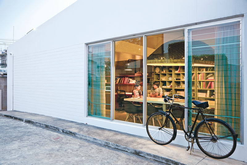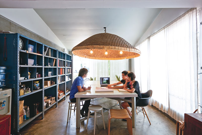 ความรู้สึกเป็นกันเองที่แทรกอยู่ในข้าวของแต่ละชิ้น ขนาดที่กระทัดรัดและบรรยากาศที่ดูน่ารัก ถ่อมตน ของสำนักงานสถาปานิกต้นนินทร์ ที่เกิดจากรวมกันของต้น – คนึงนิตย์ ฦๅไชย และคุณป๋ำ – ชนินทร์ เขมกวัฒน์ ซึ่งตั้งใจมุ่งมั่นที่จะสร้างสำนักงานออกแบบเล็กๆที่ “เราได้ทำตั้งแต่เริ่มออกแบบ ดูกระบวนการก่อสร้างไปจนกระทั่งงานเสร็จ” แทนการทำงานในบริษัทใหญ่ สำนักงานออกแบบนี้มีเพียงพนักงานสามคนช่วยกันทำงานทุกอย่างทุกขั้นตอนแบบพึ่งพาอาศัย โดยแบ่งหน้าที่คร่าวๆไว้คือ คุณป๋ำรับผิดชอบเรื่องงานสถาปัตยกรรมเกี่ยวกับการก่อสร้าง คุณต้นดูเรื่องงานตกแต่งภายใน ลงรายละเอียดวัสดุและน้องอีกคนทำงานพรีเซ็นเทชั่น