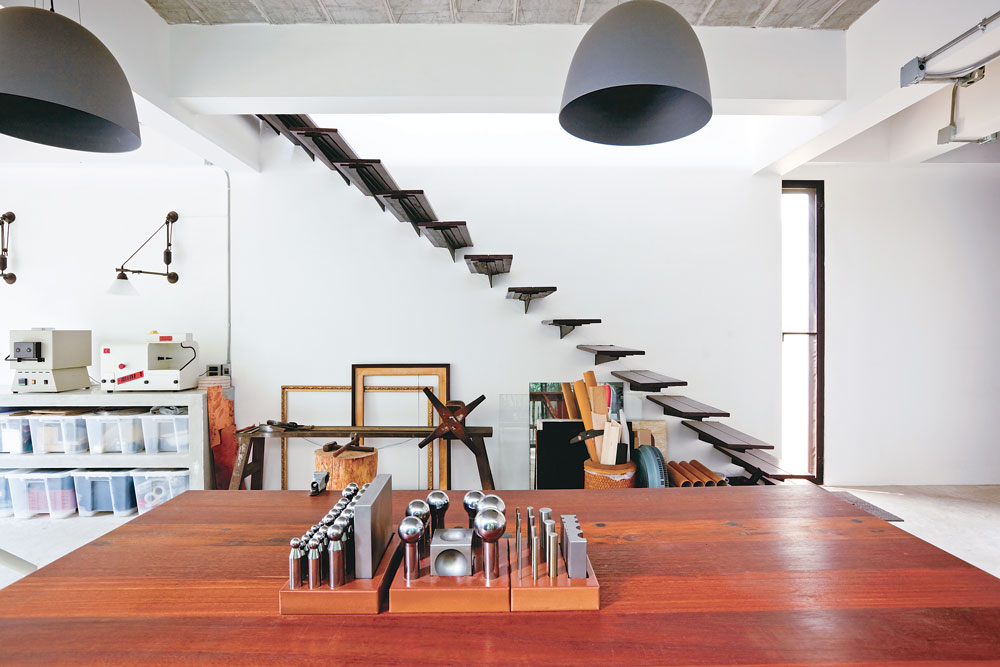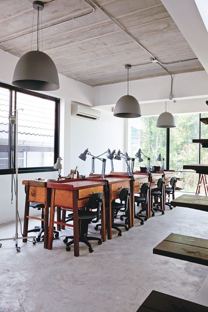 อาคารทรงกล่องหน้าตาเรียบเท่ พื้นผิวดินหยาบโชว์งานระบบ เป็นฉากหลังให้อุปกรณ์หลากชนิดที่จัดวางไว้อย่างเป็นระเบียบพร้อมใช้งาน สะอาดสะอ้าน มีบันไดเหล็กหน้าตาเท่ไม่เหมือนใครเป็นจุดเด่น บบรยากาศภายในที่ทั้งดูเท่และสบายตา อาคารสามชั้นแบ่งพื้นที่ตามความเหมาะสมดังนี้ ชั้นล่างเป็นส่วนทำงานสำหรับอุปกรณ์ชิ้นใหญ่ ชั้นสอง จัดโต๊ะทำงานที่มีลักษณะเหมือนโต๊ะทำทองเรียงชิดกันไว้สิบตัว และมีส่วนที่ใช้เผางาน ชั้นสาม แบ่งเป็นสองห้อง ห้องเรียนทฤษฎีที่ใช้เป็นห้องจัดการบรรยายด้วย และห้องสมุดที่ดูน่าสบาย