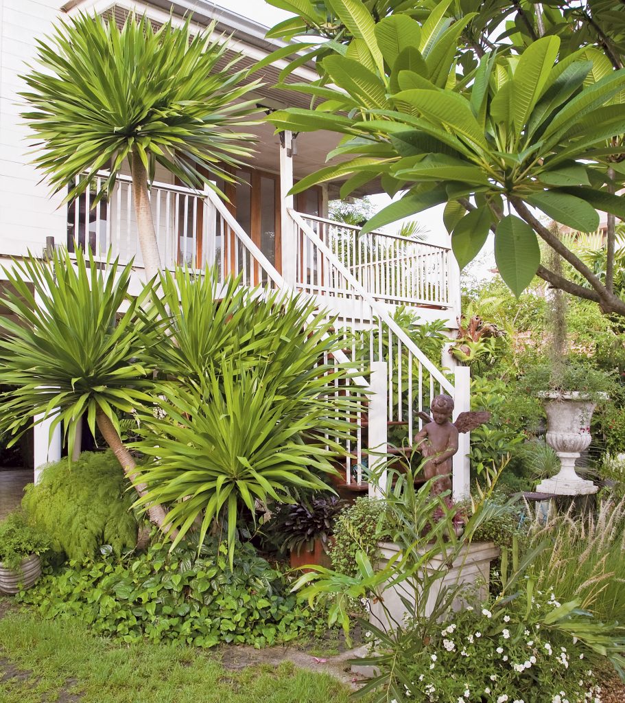 สวนด้านข้างและด้านหลังมีต้นปีบและต้นจิกเป็นไม้ใหญ่ไล่ลงมามีโมกพุดการ์ดิเนียถัดลงมาเป็นไม้ใบกระถางที่หลากหลายทั้งเฟินฟิโลเดนดรอนหน้าวัวใบโดยเลือกปลูกข่อยตัดแต่งเป็นรั้วเพื่อความนุ่มนวลพื้นปูอิฐมอญที่มีมอสส์ขึ้นสวยเพราะได้แสงรำไร ไม้ใบที่เลือกมาใช้ส่วนใหญ่เป็นไม้กระถางนอกจากเพื่อการปรับเลี่ยนแล้วไม้ใบบางชนิดถ้าลงดินจะไม่ดีเท่าที่ควรเพราะเหมาะกับวัสดุปลูกที่มีส่วนผสมของกาบมะพร้าวมากกว่าเพื่อการระบายน้ำที่ดี