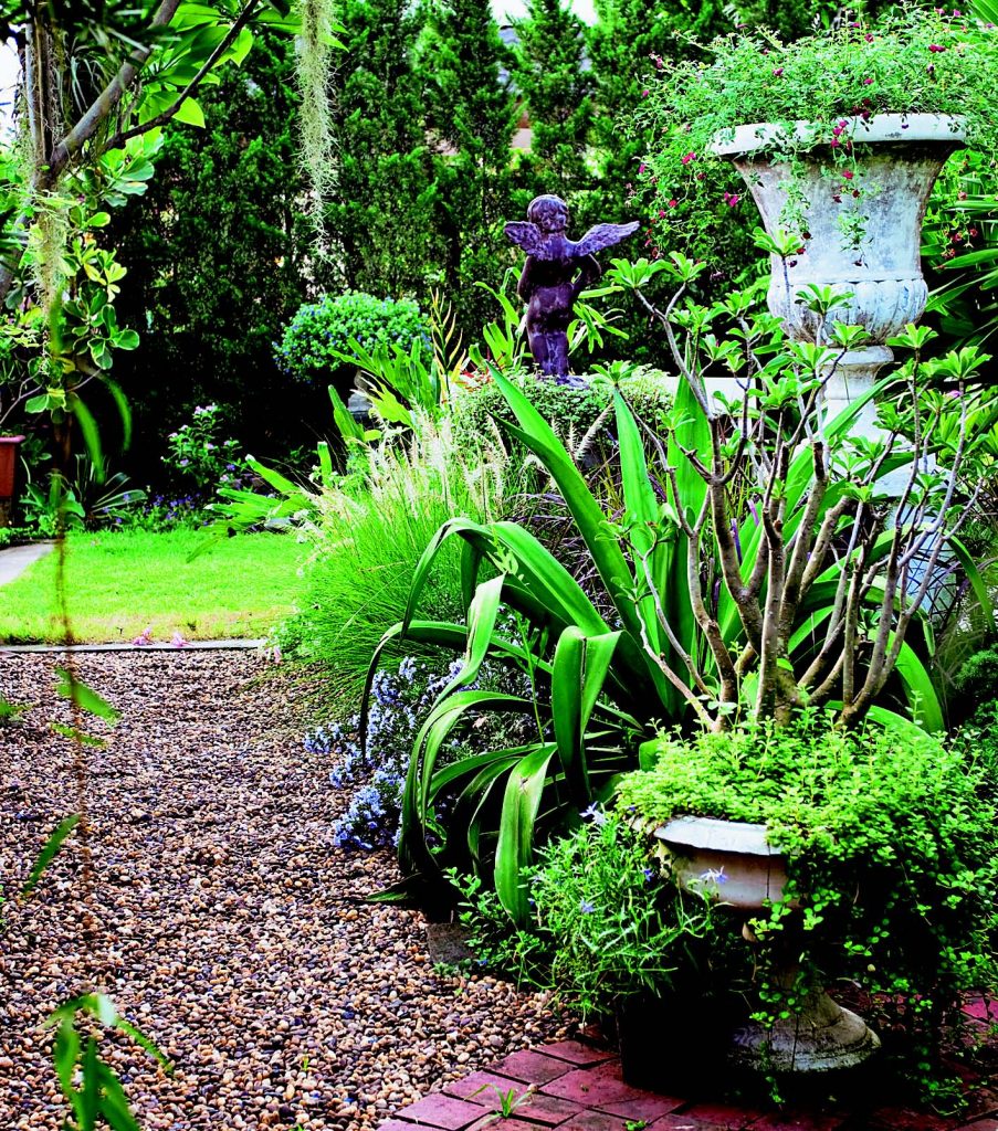 สไตส์สวนนั้นได้แนวคิดมาจากตัวบ้านและความชอบของทั้งคู่เองโดยทั้งคู่เป็นคนชอบทั้งไม้ดอกและไม้ใบเพราะฉะนั้นตำแหน่งของแสงและตำแหน่งของบ้านจึงเป็นตัวกำหนดรูปแบบ มุมหน้าบ้านที่ได้รับแสงตอนเช้าจึงมีสีสันของไม้ดอกมากมายเล่นลวดลายบนพื้นด้วยอิฐมอญเรียงกันเป็นวงกลมแล้วจัดวางทางเดินตามโค้งของพื้นอิฐโดดเด่นด้วยม้านั่งสีฟ้าและอ่างน้ำนกซึ่งเป็นสินค้าของ Little Tree