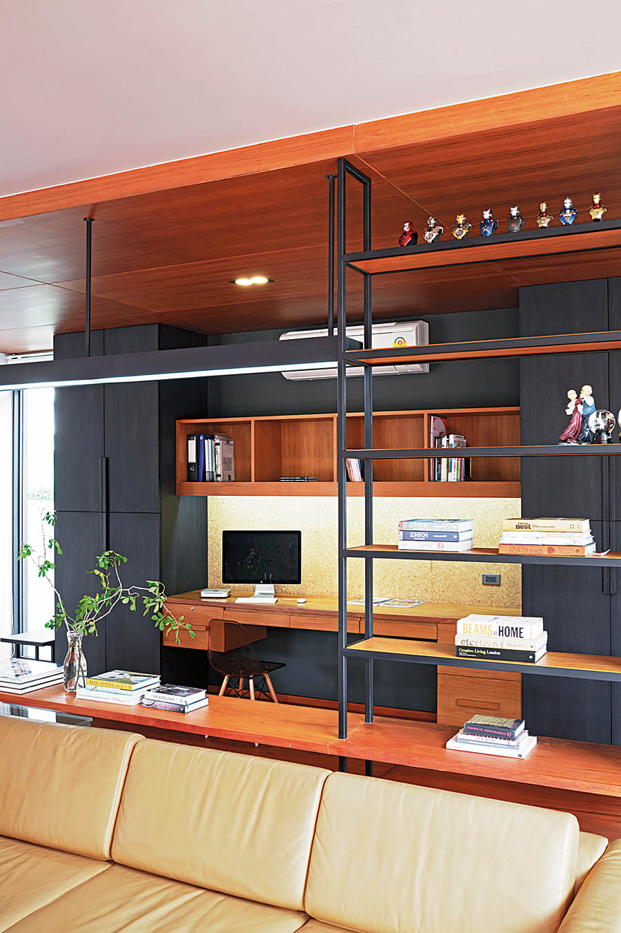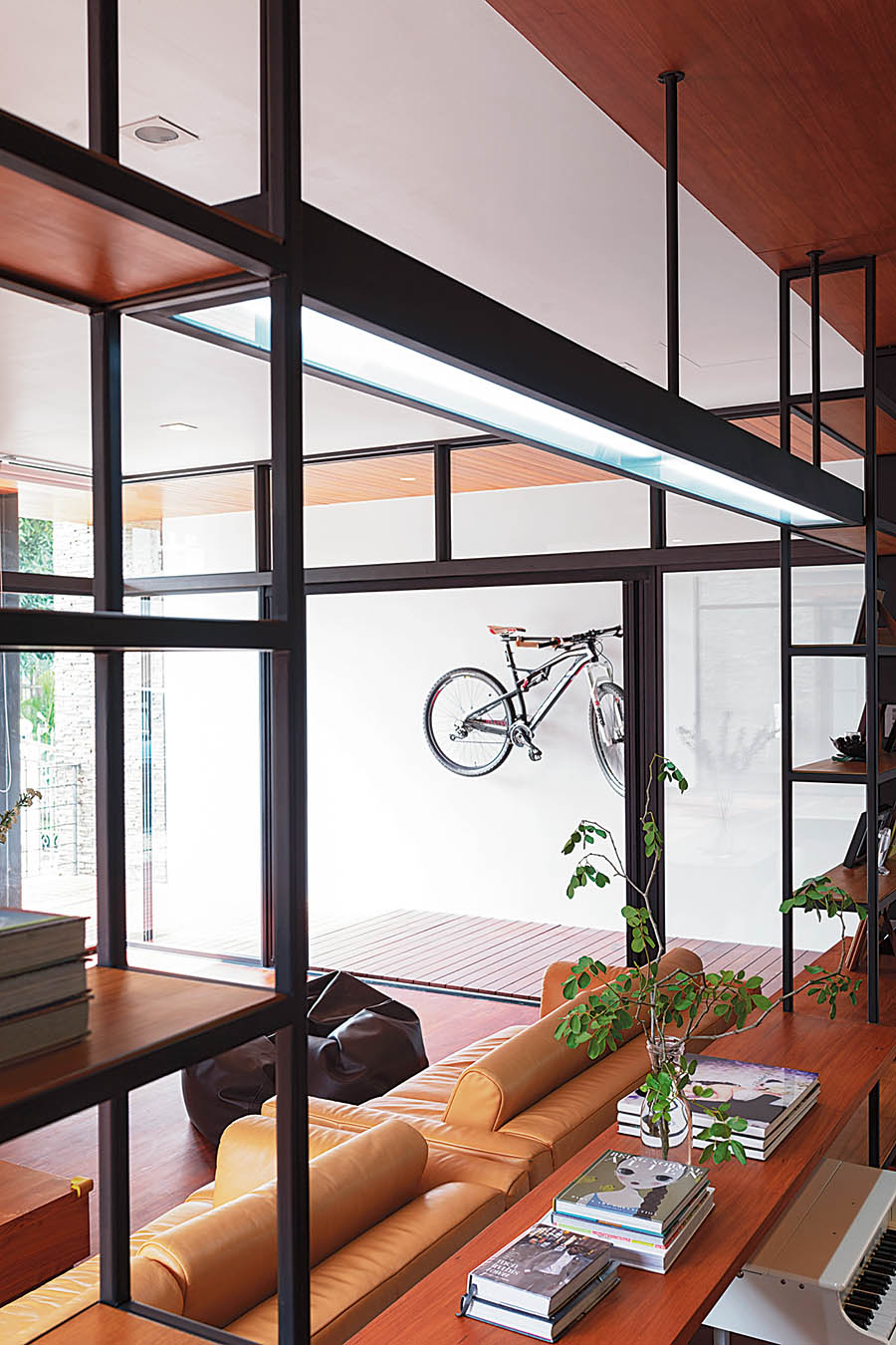 ในส่วนของพื้นที่ใช้งานชั้นล่างแบ่งออกเป็นห้องรับแขก ออกแบบผนังโดยรอบเป็นบานประตูกระจกใส ใช้วัสดุดูเรียบง่าย เช่น โซฟาหนังสีครีม กั้นผนังเบาๆระหว่างมุมนั่งเล่นกับส่วนทำงานด้วยชั้นเหล็ก รวมถึงงานบิลท์อินไม้สีธรรมชาติที่ดูกลมกลืนสบายตา ซึ่งใช้ทำกิจกรรมทั้งดูโทรทัศน์และต้อนรับเพื่อนฝูง ในขณะที่ห้องครัวและส่วนรับประทานอาหารเลือกใช้โทนสีดำเป็นหลักสลับกับไม้ ออกแบบเป็นไอส์แลนด์เพื่อให้ปรับการใช้งานได้หลายรูปแบบ รวมถึงเติมเสน่ห์ด้วยการใช้สตูลสีส้มสด ทำให้มุมนี้ดูน่านั่ง ซึ่งส่วนนี้จะเชื่อมต่อกับบ้านของคุณพ่อคุณแม่ด้วยสนามหญ้าเล็กๆและทางเดินด้านข้าง