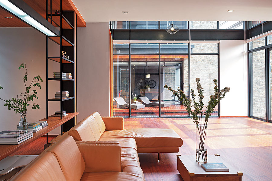 ด้วยความที่พื้นที่ค่อนข้างแคบ สถาปนิกจึงออกแบบพื้นที่ใช้สอยเป็นแบบเปิดโล่ง เพื่อลดความทึบของตัวบ้านที่ดูคล้ายกล่อง นอกจากนี้ยังมีช่องรับแสงจากประตูและหน้าต่างโดยรอบเป็นจำนวนมาก เมื่อเปิดช่องเหล่านี้พร้อมกัน จึงมีทั้งแสงสว่างและลมพัดผ่านตัวบ้านแทบจะตลอดเวลา