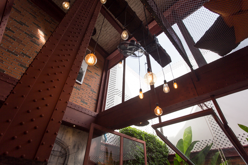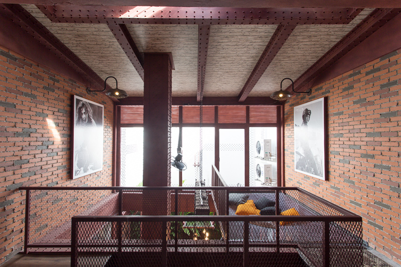 เมื่อเดินเข้ามาดูใกล้ๆ ส่วนของผนังภายในอาคาร ถูกออกแบบราวกับเป็นผนังอิฐเปลือยดั้งเดิมรูปแบบลอฟท์ แต่ดัดแปลงด้วยการนำ Shera Wall Ceiling Skirt (ไม้มอบ เฌอร่า) ไปทำสีให้สวยงามใกล้เคียงกับโทนสีของอิฐธรรมชาติมากที่สุด ด้วยการไล่ระดับของโทนสีที่แตกต่างกันถึง 3 เฉดสี จากนั้นจึงนำไปตัดให้มีขนาดใกล้เคียงกับขนาดของก้อนอิฐจริง พร้อมนำไปแปะลงบนผนังด้วยปูนกาว โดยติดในลักษณะเดียวกันกับการปูกระเบื้อง เพื่อช่วยให้ผนังดูสวยงามเหมือนตกแต่งด้วยอิฐธรรมชาติอย่างแท้จริง