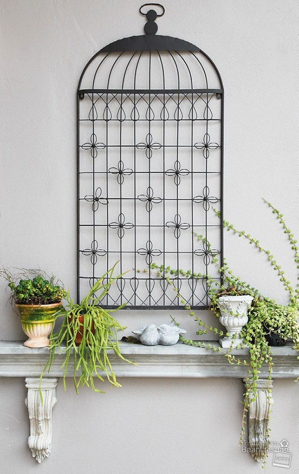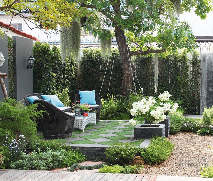 ตกแต่งด้วยกระถางเอิร์นปูนใบใหญ่ มีฉากหลังเป็นผนังปูนสีเทาตกแต่งด้วยกรอบสีขาวด้านใน มองแล้วคล้ายกรอบรูปขนาดใหญ่ ถัดไปวางม้านั่งไม้ทรงสวยเป็นมุมนั่งเล่นเล็กๆอีกมุมที่ติดกับโรงจอดรถ ซึ่งกั้นแบ่งพื้นที่ด้วยกรงนกเหล็กดัดที่ปลูกต้นไม้หลายขนาดแขวนเรียงรายดูอ่อนหวานนุ่มนวล พื้นสวนโรยกรวดสีน้ำตาล วางแผ่นทางเดินสี่เหลี่ยมฉลุลาย