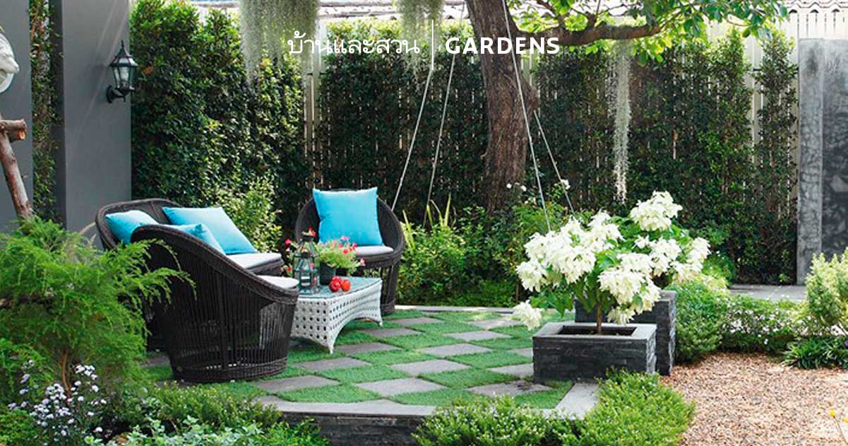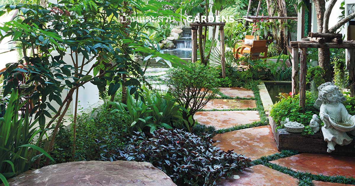 หลังพูดคุยกับเจ้าของบ้าน ผมและทีมงานก็เดินสำรวจสวนทั่วทุกมุม ภาพที่เห็นเป็น สวนอังกฤษ แบบผสมผสานที่อบอุ่น แต่ก็ดูนิ่งๆ สุขุมอยู่ในที มีมุมนั่งเล่นหลายมุม ที่เด่นสะดุดตาคือลานนั่งเล่นพักผ่อนขนาดใหญ่ซึ่งยกระดับให้สูงกว่าพื้นที่ส่วนอื่นๆ จัดวางชุดเก้าอี้สานด้วยเชือกดูแปลกตา วางหมอนอิงใบโตสีขาว ฉากหลังเป็นผนังปูนสูงสีเทาเข้มให้ความรู้สึกสงบ เป็นมุมพักผ่อนในบรรยากาศที่น่านั่งท่ามกลางร่มเงาของไม้ใหญ่ มองทางด้านซ้ายเห็นบ่อน้ำพุเล็กๆ