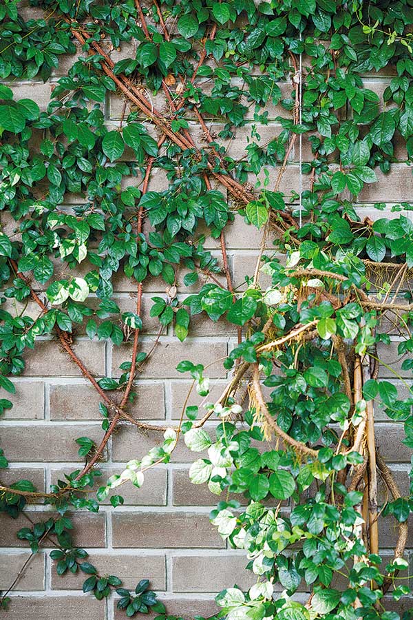 หากระเบียงของคุณมีพื้นที่ค่อนข้างยาว มีแดดส่องถึงในช่วงบ่ายซึ่งทำให้ห้องร้อน การปลูกไม้เลื้อยเป็นทางเลือกที่ดีไม่น้อย โดยขึงเส้นเอ็นเล็กๆ หรือใช้ตาข่ายพลาสติกผูกยึดห้อยลงมาจากพื้นด้านบนให้ไม้เลื้อยพันเกาะเกี่ยวขึ้นไป แนะนำว่าให้เลือกต้นที่โตช้าๆ ใบละเอียดจะดูนุ่มนวลสวยงาม เช่น เหลืองชัชวาล ม่วงมณีรัตน์สายน้ำผึ้ง แส อัญชัน พุทธชาด และมะลิก้านแดง คอยตัดแต่งให้ไม่รกเกินไป เพียงเท่านี้ก็จะได้ที่บังแดดจากธรรมชาติที่ทั้งสวยและดูแลง่าย