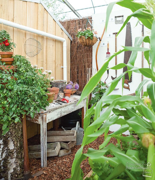 การทำงานในสวนให้สนุก นอกจากใจรักแล้ว การจัด มุมทำงานในสวน ดีๆก็ทำให้การเพาะกล้า ย้ายต้นไม้ ไม่หนักหนาสาหัสเกินไป มุมนี้อาจมีสิ่งอำนวยความสะดวกเพื่อให้เราใช้งานได้ง่ายขึ้น เช่น โต๊ะ เก้าอี้ อ่างล้างมือ อีกทั้งควรจัดระเบียบให้มีที่เก็บของ จัดวางวัสดุอุปกรณ์ต่างๆ
