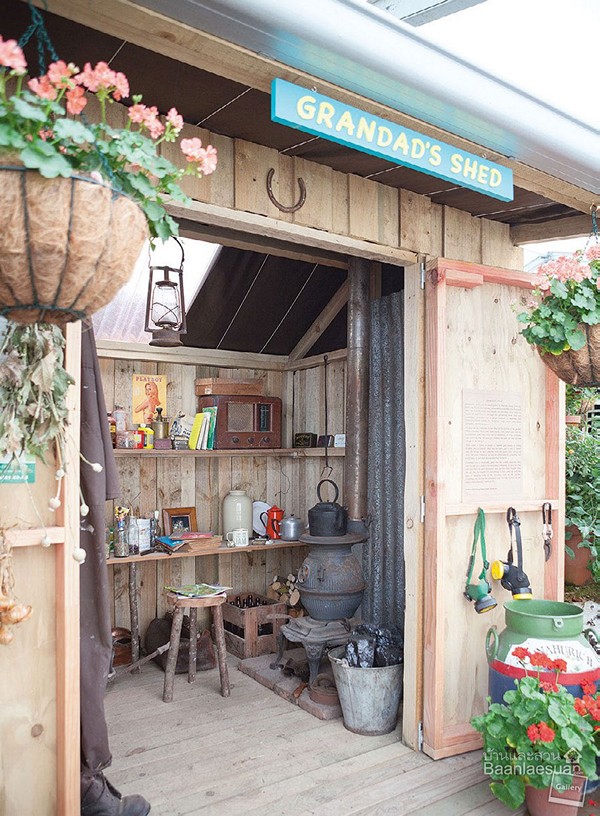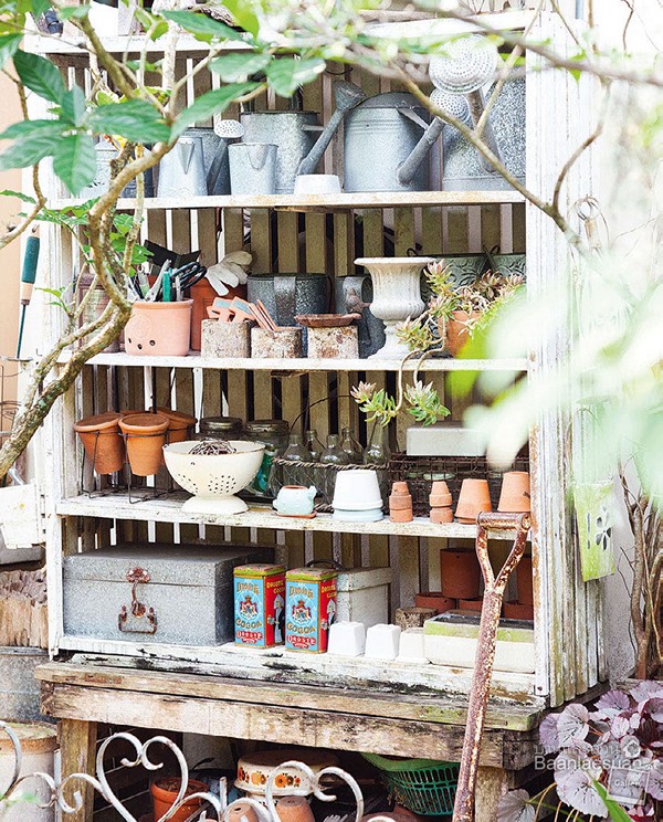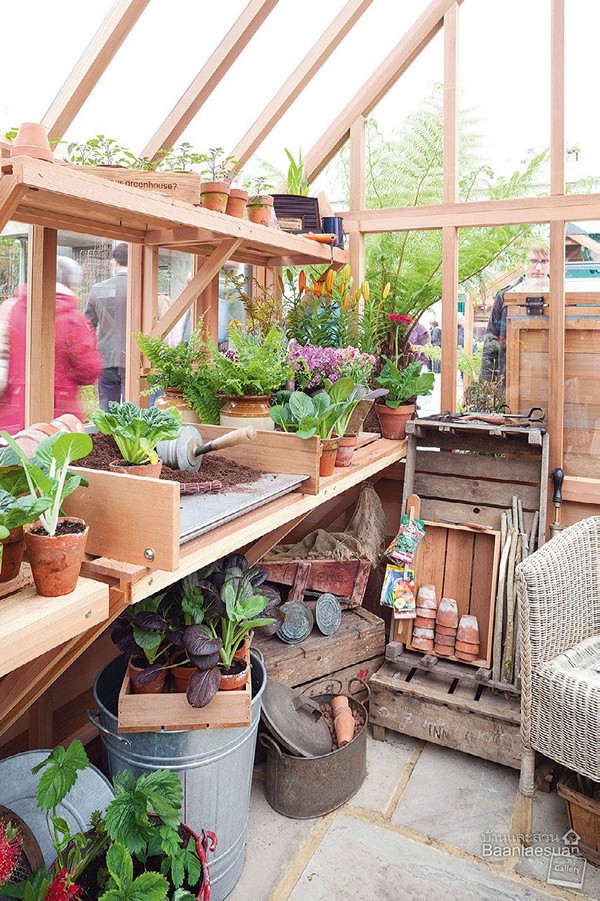 ห้องเก็บของ หากบ้านมีบริเวณสักหน่อยอาจแบ่งพื้นที่ส่วนหนึ่งเป็นห้องเก็บของและอุปกรณ์ในสวนด้วยก็ได้ เพราะจะเก็บอุปกรณ์ได้เป็นระเบียบและทนทานนานมากกว่า หากเป็นห้องเล็กๆก็ทำชั้นวางและเก็บวัสดุอุปกรณ์ด้านใน แต่หากมีห้องใหญ่สักหน่อยอาจวางโต๊ะทำงาน หรือถ้าจัดไว้สวยๆจะแบ่งพื้นที่เป็นมุมนั่งเล่นด้วยก็ยังได้ ใครไม่อยากยุ่งยากลงมือทำห้องเก็บของเอง ลองหาซื้อบ้านเก็บของสำเร็จรูปซึ่งมีให้เลือกหลายขนาดและรูปแบบมาวางในสวนก็ได้
