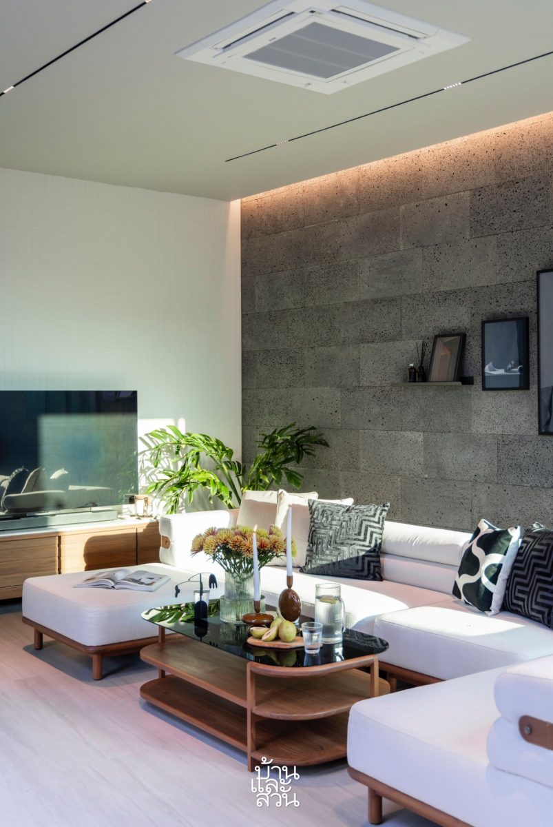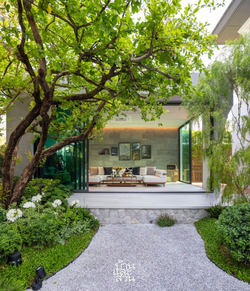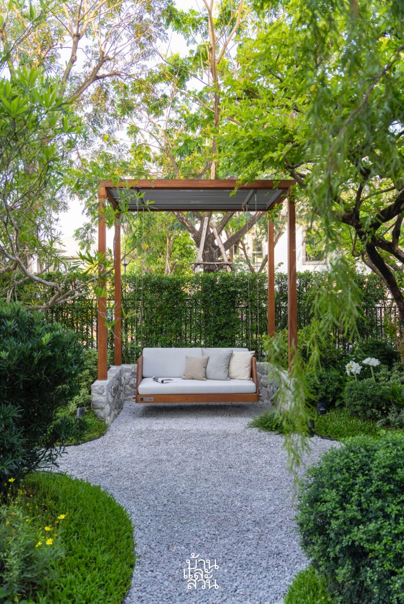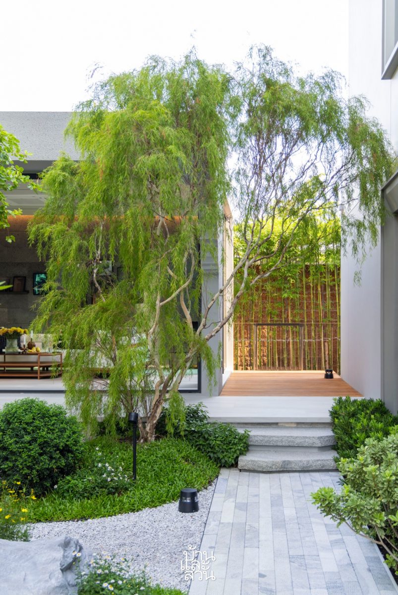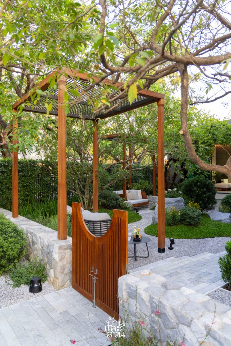 จัดพื้นที่นอกบ้านให้เป็นมุมพักกายพักใจจากความเหนื่อยล้าภายนอก ออกแบบมุมนั่งพักผ่อนแทรกไปกับพรรณไม้นานาชนิดและเว้นจังหวะแปลงต้นไม้ให้มีทั้งเปิดโล่งและพรางสายตา ในสไตล์ สวนโมเดิร์นเจแปนีส เมื่อเข้ามาภายในนี้ จึงรู้สึกได้ถึงความสงบที่ตัดขาดความวุ่นวายจากภายนอกอย่างสิ้นเชิง