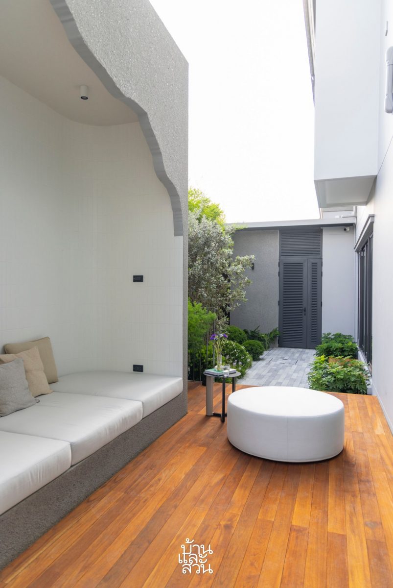 ด้านในสุดออกแบบเป็นห้องพักผ่อนในสวนที่สามารถเปิดประตูออกกว้างโอบล้อมด้วยต้นไม้สีเขียวแสนร่มรื่น จากมุมนี้ปูพื้นไม้สักเป็นเทอร์เรสต่อเนื่องยังหลังบ้านที่ซ่อนมุมนั่งเล่นเอาไว้ อีกมุมทำเป็นที่นั่งทรงกล่องสี่เหลี่ยมใช้งานเป็นเดย์เบดแสนสบายและเป็นส่วนตัว