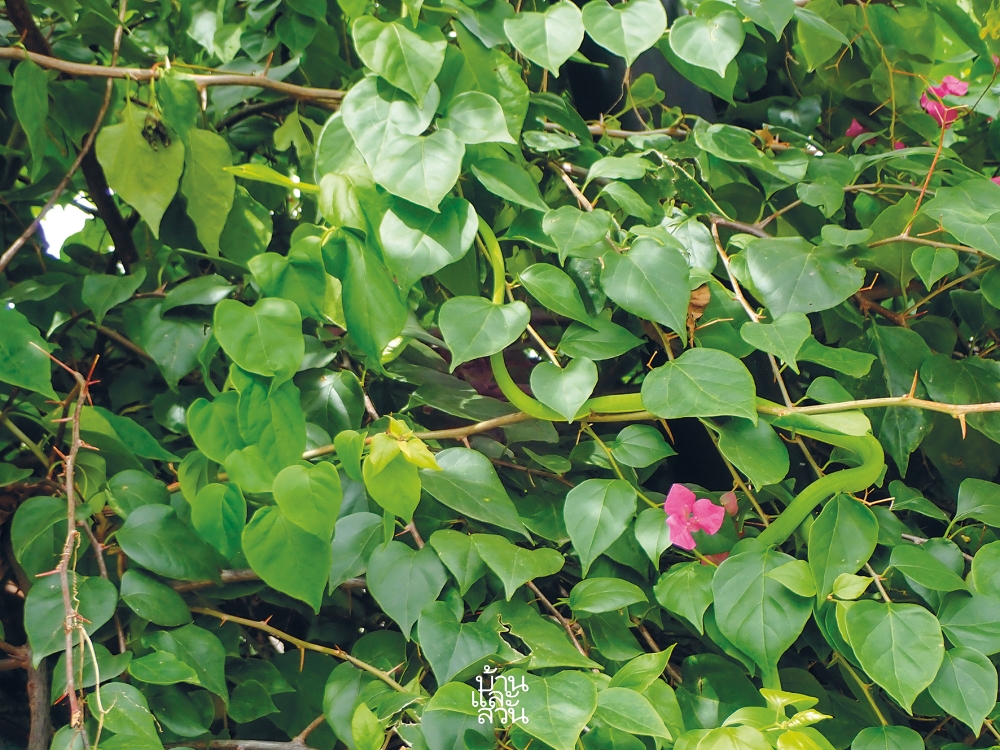 -งูเขียวพระอินทร์ พบได้บ่อยแม้อยู่ในเมือง มีลายงีเขียวสลับดำ ขึ้นต้นไม้และอาคารเก่ง มักพบตามขอบประตูและหน้าต่าง